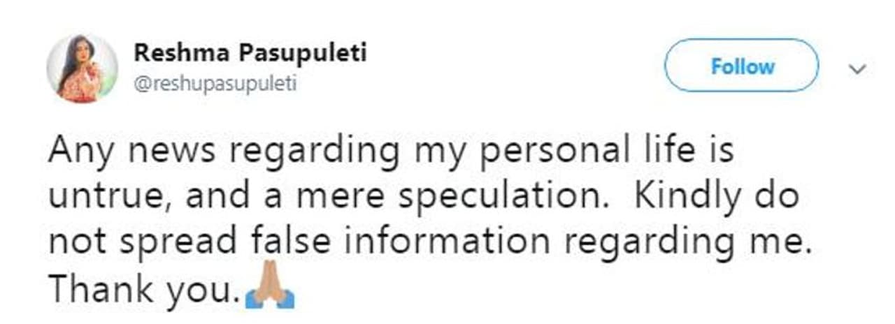இந்நிலையில், இதற்கு நடிகை ரேஷ்மா தனது ட்விட்டர் பக்கம் மூலம் காட்டமாக விளக்கமளித்துள்ளார். அதில், "என் தனிப்பட்ட வாழ்க்கை தொடர்பான செய்திகள் பொய்யானவை.