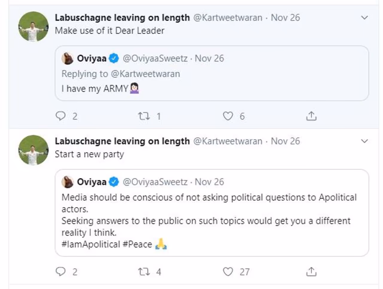 சமீபத்தில் தனியார் நிகழ்ச்சி ஒன்றில் பங்கேற்ற ஓவியாவிடம் ரஜினி, கமல் அரசியல் பிரவேசம் குறித்து கேட்கப்பட்ட கேள்வி கோபத்தை உருவாக்கியது. அதற்கு பதிலளிக்க மறுத்த ஓவியா, தனது டுவிட்டர் பக்கத்தில் அரசியல் சாராத நடிகர், நடிகைகளிடம் ஊடகங்கள் அரசியல் குறித்த கேள்விகளை தவிர்க்க வேண்டும் என்று பதிவிட்டார். அந்த பதிவில் கமெண்ட் செய்த ஓவியா ரசிகர் ஒருவர், நீங்கள் புதிய அரசியல் கட்சி ஆரம்பியுங்கள் என கொளுத்திப் போட்டார்.