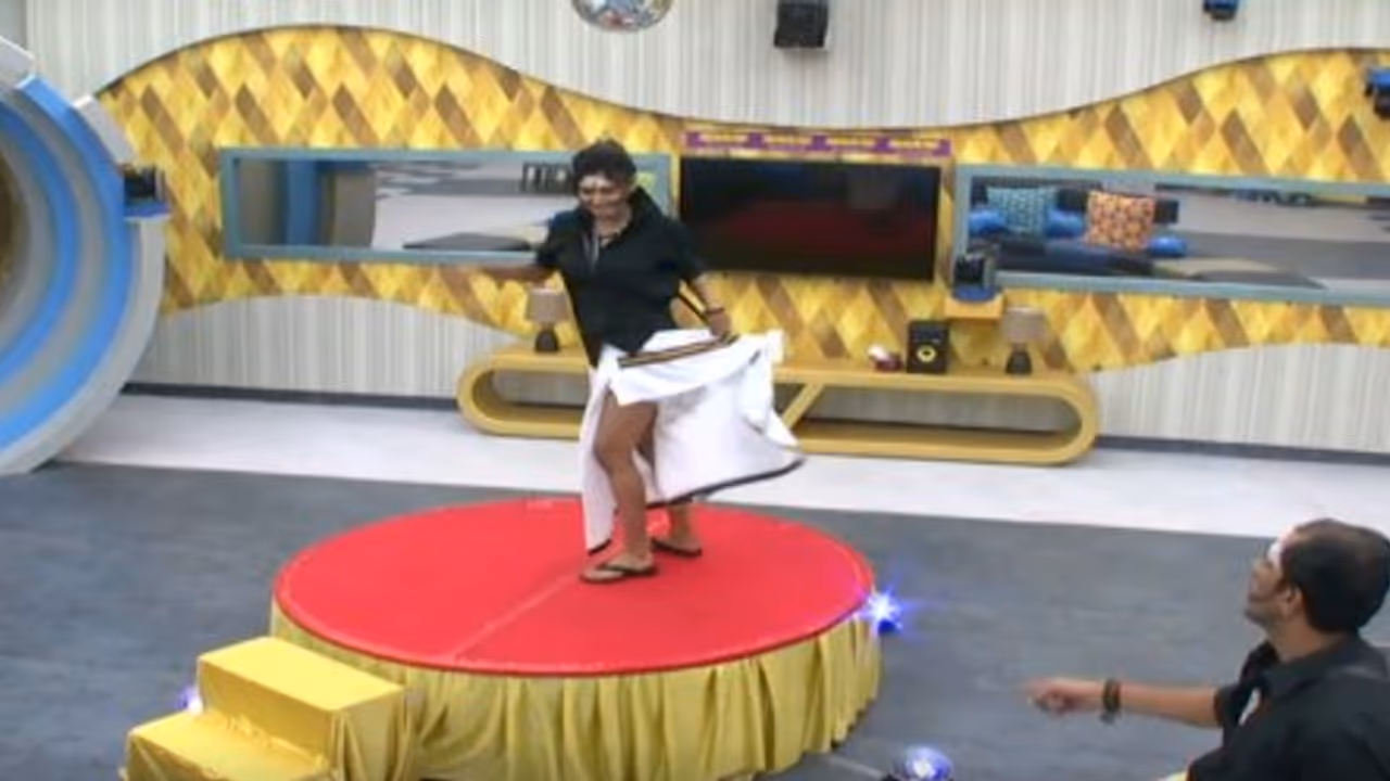 நேற்றைய பிக் பாஸ் நிகழ்ச்சியில், போட்டியாளர்கள் ஒவ்வொருவரும் நடிகர் கமலஹாசனின் ஒரு பாடலை தேர்வு செய்து, "விருமாண்டி" படத்தில் வரும் கமலஹாசனை போல் வேஷமிட்டு வேஷ்டி, கருப்பு சட்டை அனைத்து டான்ஸ் ஆட வேண்டும் என்று கூறப்பட்டிருந்தது.
