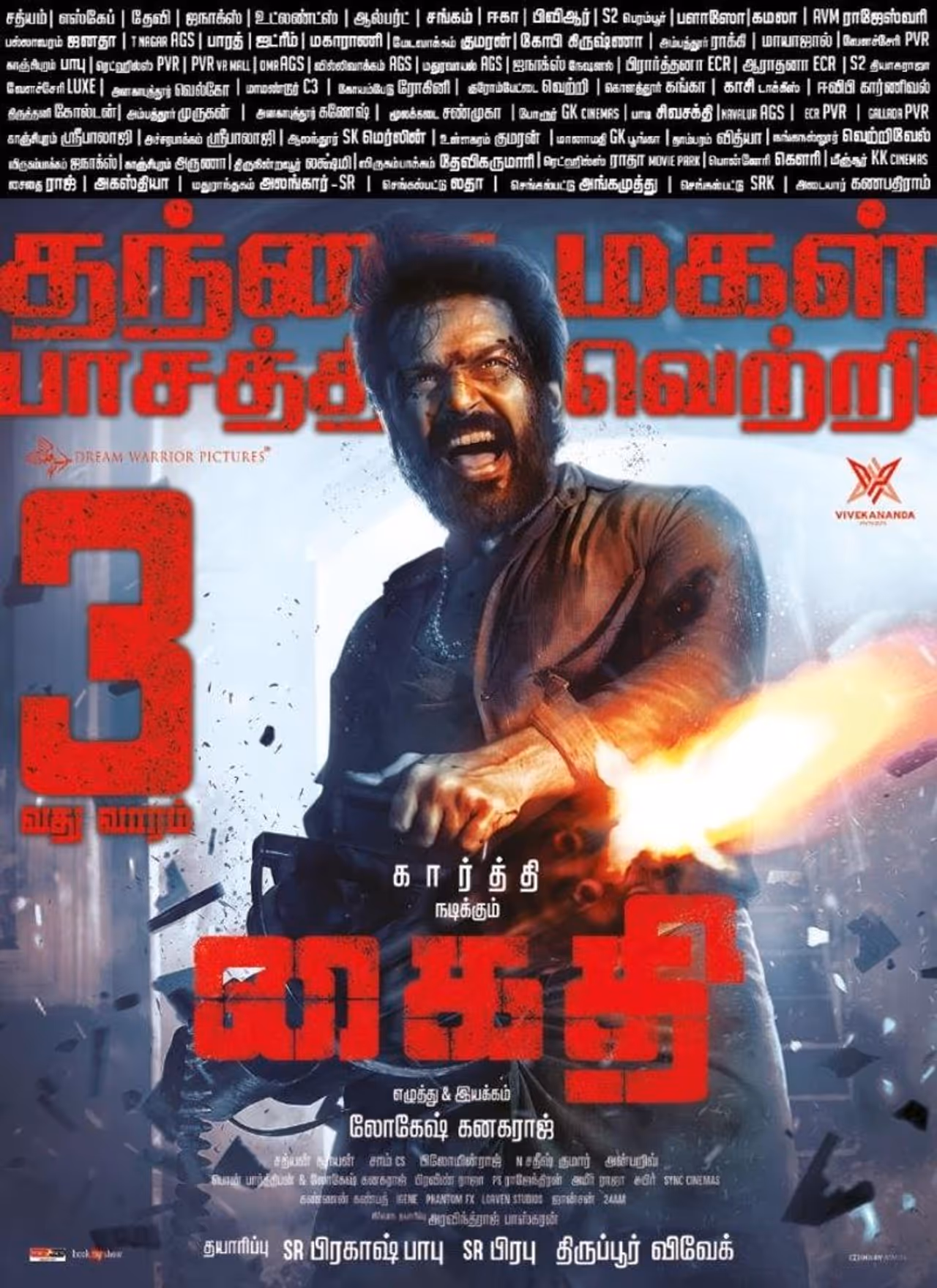 'மாநகரம்' படத்தை இயக்கிய லோகேஷ் கனகராஜ் இயக்கத்தில் கார்த்தி நடித்த படம் 'கைதி'. தீபாவளி ஸ்பெஷலாக வெளியான படம் 'கைதி'. தந்தை - மகள் செண்டிமென்ட்டுடன், ஒரே இரவில் நடக்கும் வித்தியாசமான கதைக்களத்தில் வெளிவந்து விமர்சன ரீதியாகவும், வசூல் ரீதியாகவும் அசத்தலான வரவேற்பை பெற்றது. விஜய்யின் 'பிகில்' என்ற பிரம்மாண்ட படத்துக்கு போட்டியாக வந்தததால் 'கைதி' படத்திற்கு, ஆரம்பத்தில் 250 திரையரங்குகளே கிடைத்தன. இதனால், மிக குறைந்த தியேட்டர்களிலேயே வெளியான 'கைதி' படம், ரசிகர்களிடம் கிடைத்த அமோக வரவேற்பால், தற்போது 350 தியேட்டர்களில் வெற்றிகரமாக ஓடிக்கொண்டிருக்கிறது. பாடல், ஹீரோயின் இல்லாமல் முழுவதும் கதையை மட்டுமே நம்பி களமிறங்கிய 'கைதி' திரைப்படம் ரசிகர்களிடம் மிகுந்த வரவேற்பை பெற்றது. படத்தை பார்த்த பல தரப்பினரும் 'கைதி' திரைப்படத்தை வெகுவாக பாராட்டி வருகின்றனர்.