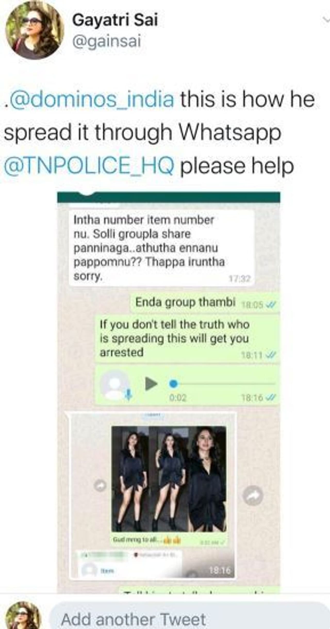 பீட்சா டெலிவரி பாயான பரமேஸ்வரன் ஆபாச வீடியோக்களை பகிரும் வாட்ஸ் அப் குரூப்பில் காயத்ரி ராவின் எண்ணை ஐட்டம் என்று குறிப்பிட்டு பகிர்ந்துள்ளார்.