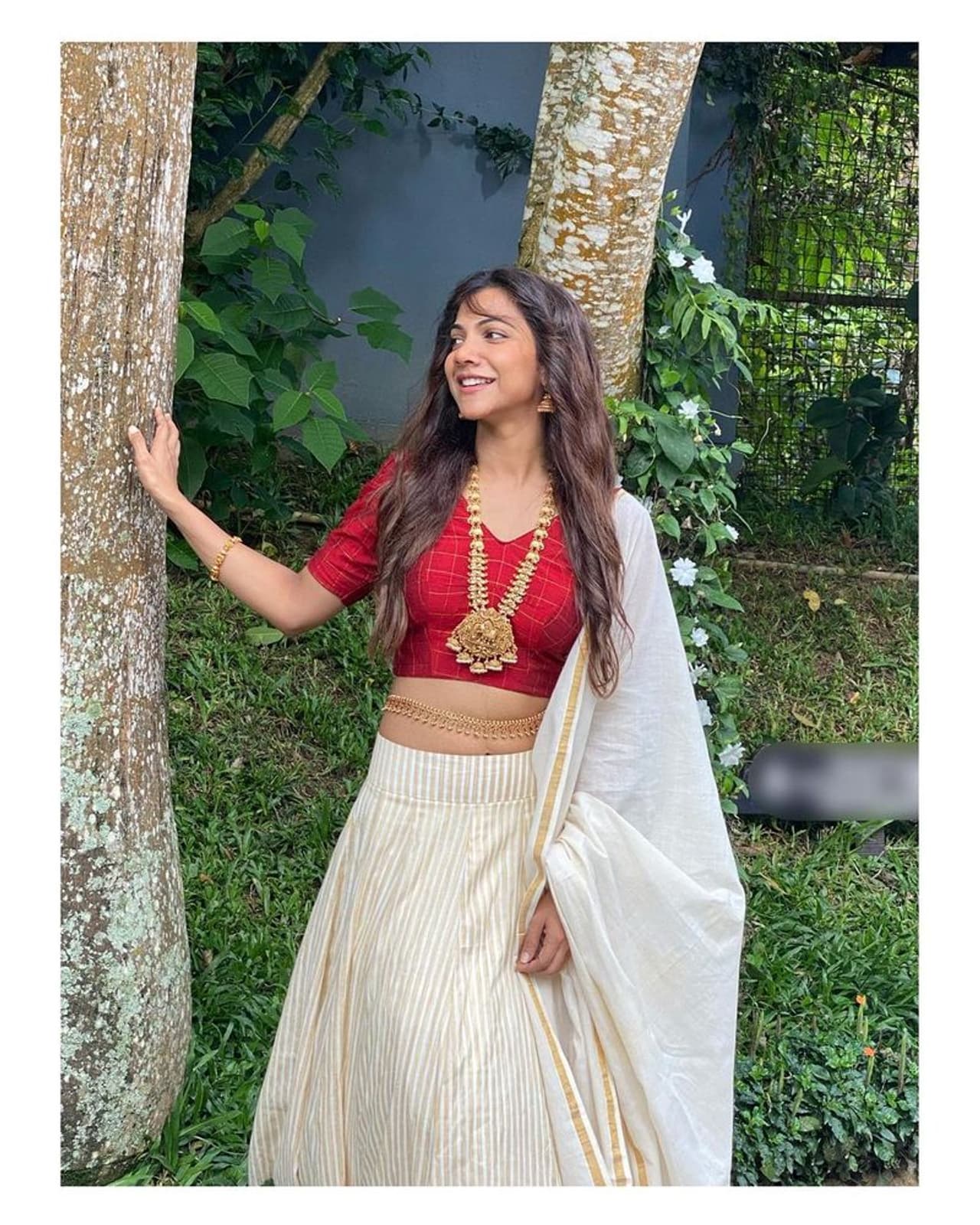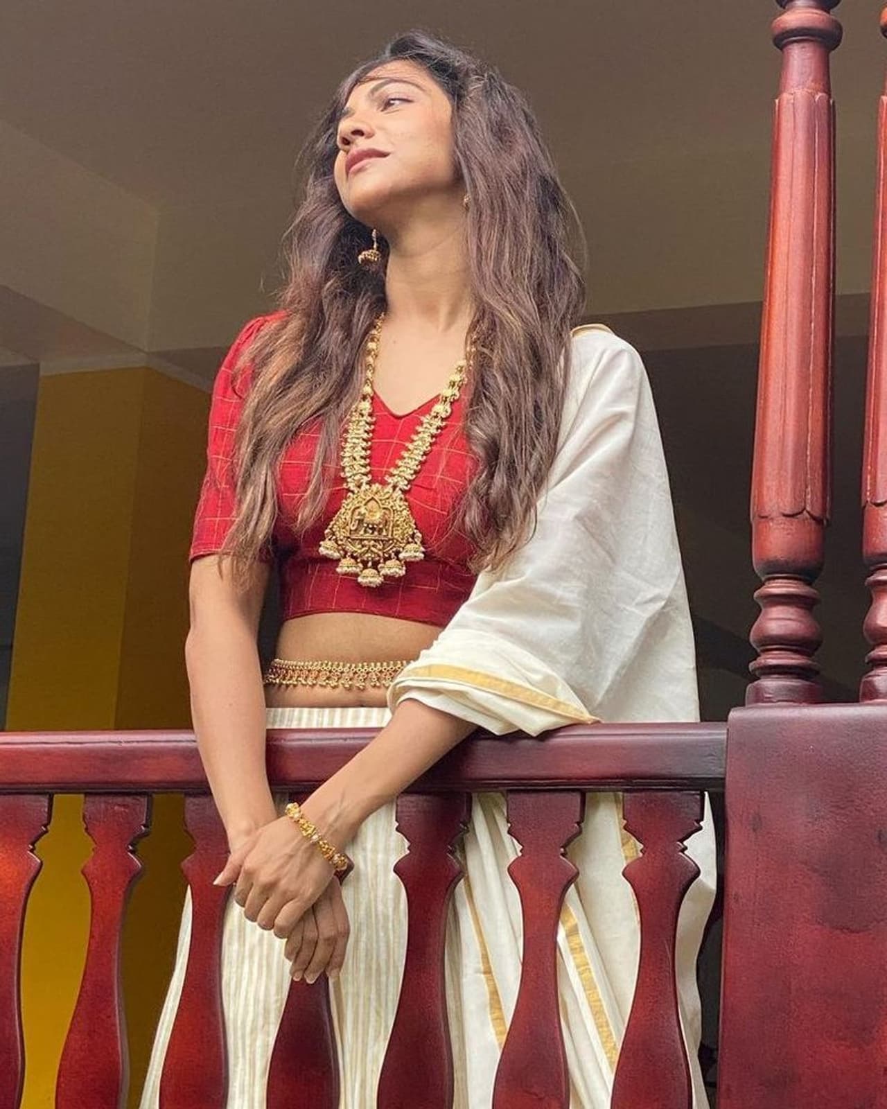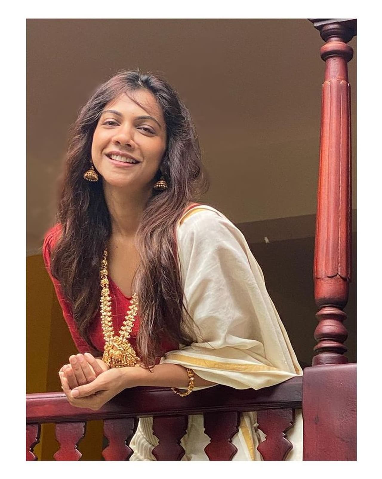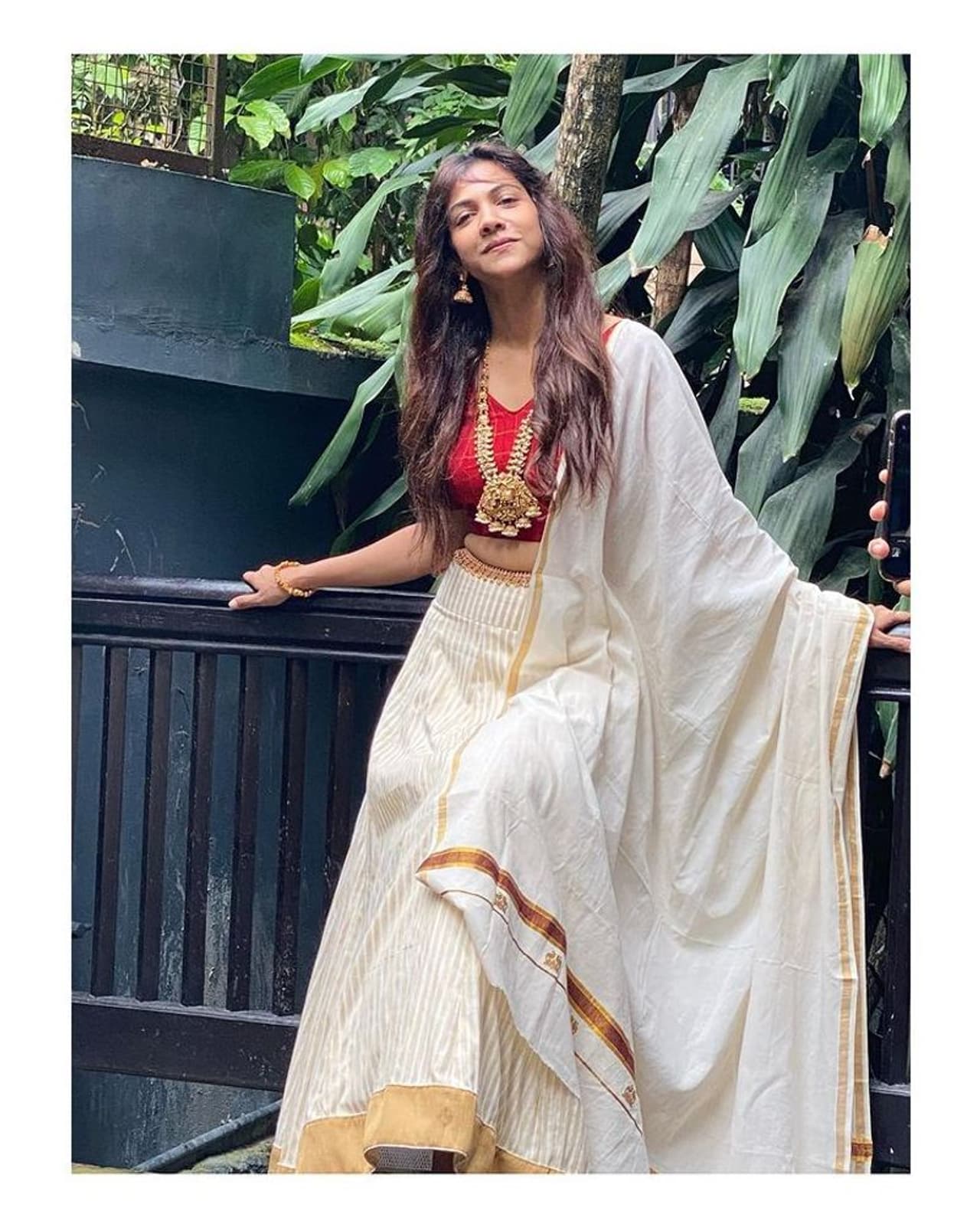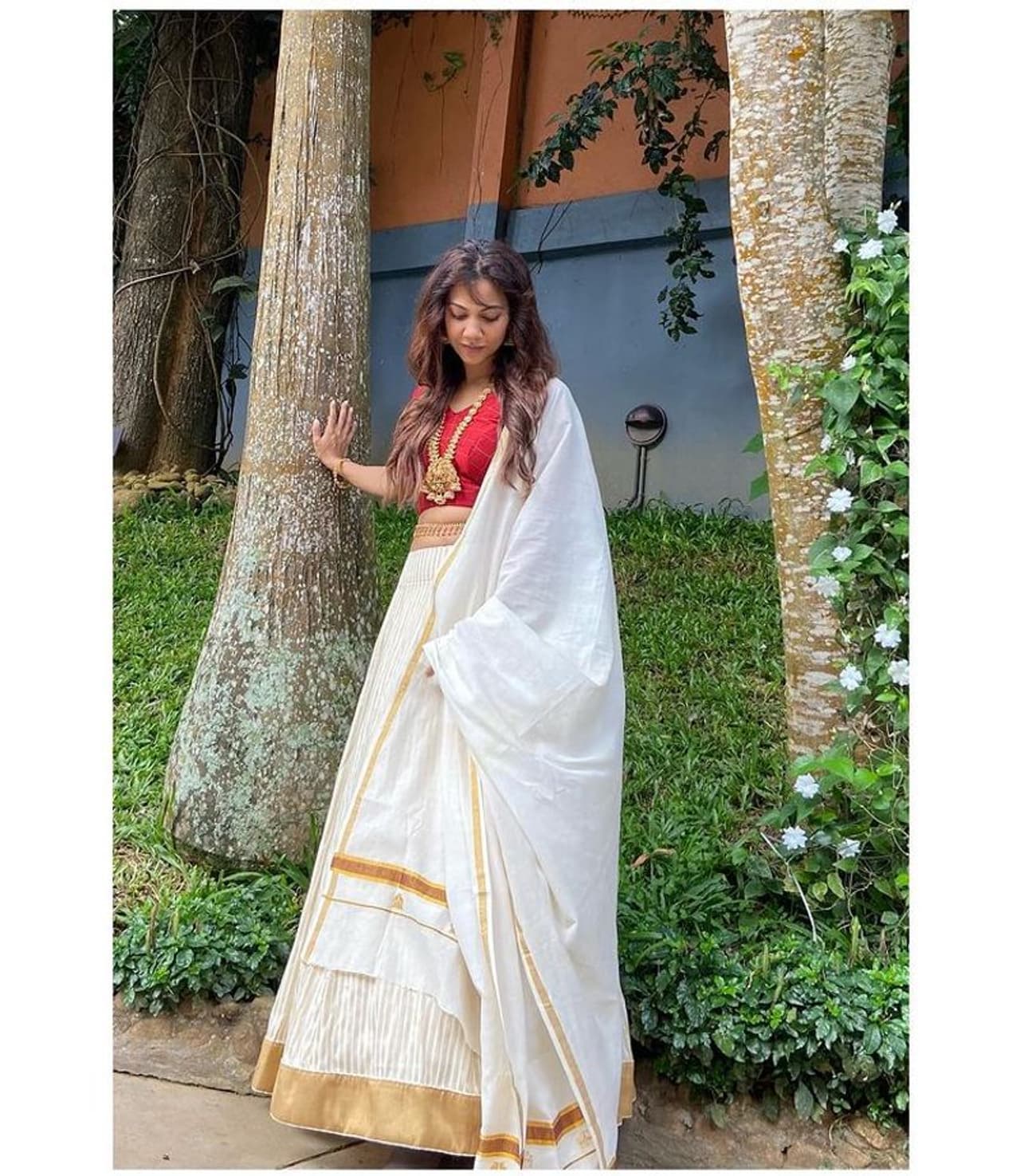 செதுக்கிய சிலை போல் நின்று... கேரள உடையில் பாரம்பரிய முறைப்படி ஓணம் பண்ணிகை கொண்டாடும் நடிகை