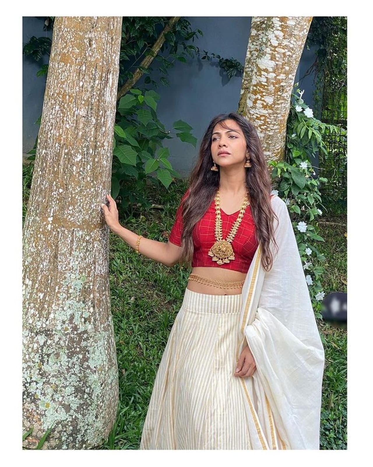 மரத்தில் கை வைத்தபடி மயக்கும் பேரழகி... அதிலும் ஓணம் பண்டிகையில் ரசிகர்களை ஈர்க்கும் ஒய்யார அழகு...