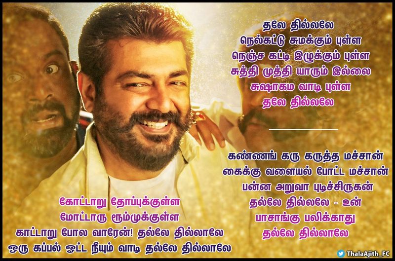 அருண் பாரதி எழுதி அந்தோனி தாசன் குரலில் தல்லே தில்லாலே கிராமிய பாடல் தல ரசிகர்களுக்கு செம்ம ட்ரீட்.