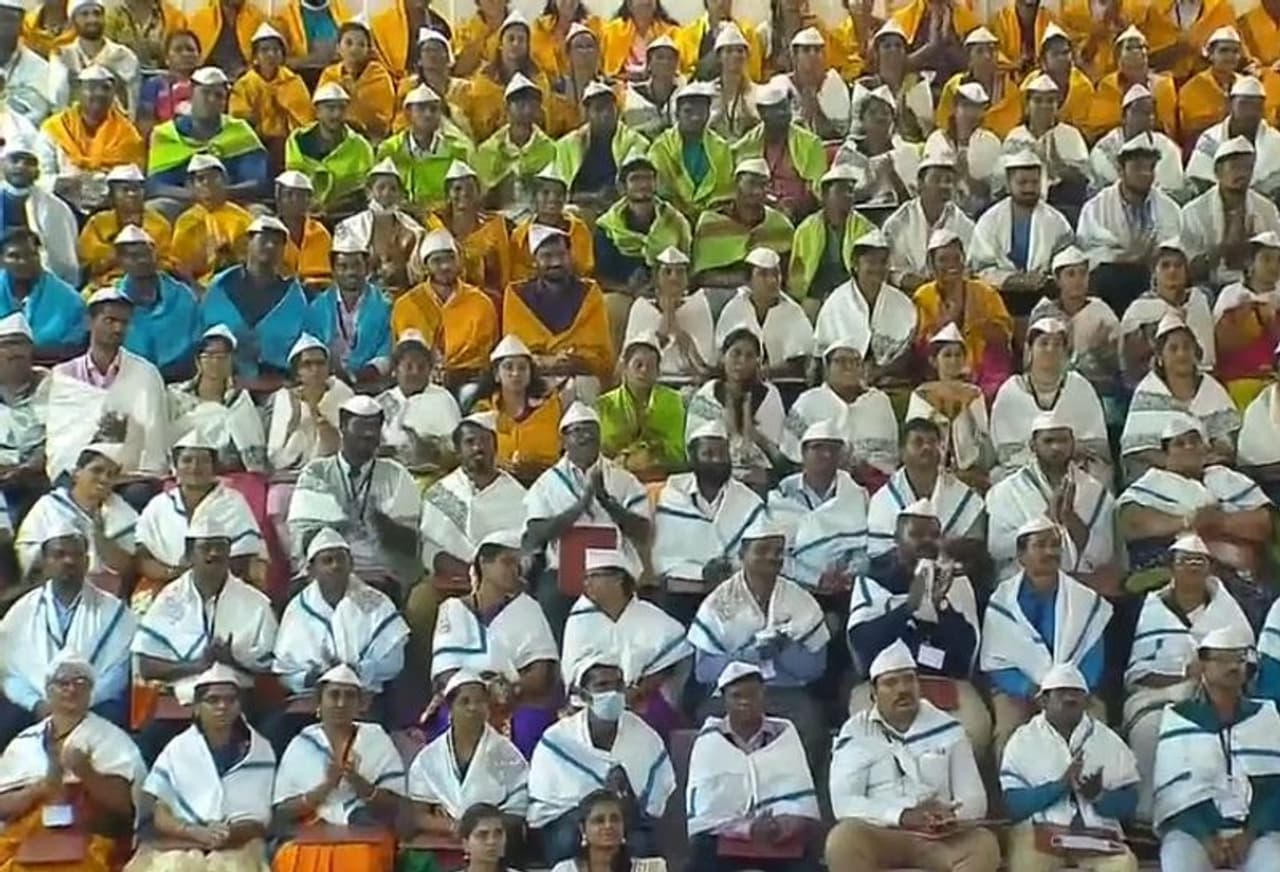 பின்னர் காந்தி தொப்பி அணிந்தபடி மேடைக்கு வந்த பிரதமர். 2018 - 2019 ஆண்டுகள் மற்றும் 2019 - 2020 கல்வி ஆண்டில் பல்கலைக்கழகத்தில் பயின்ற மாணவர்களுக்கு பட்டம் வழங்கினார். இதைத்தொடர்ந்து பிரதமர் இசைஞானி இளையராஜா, திரையுலகில் 1000 படங்களுக்கு மேல் இசையமைத்து, சாதனை படைத்து... தொடர்ந்து தன்னுடைய இசை பணியை ஆற்றிய வரும் இளைய ராஜாவுக்கு கௌரவ டாக்டர் பட்டத்தை வழங்கி கௌரவித்தார்.
