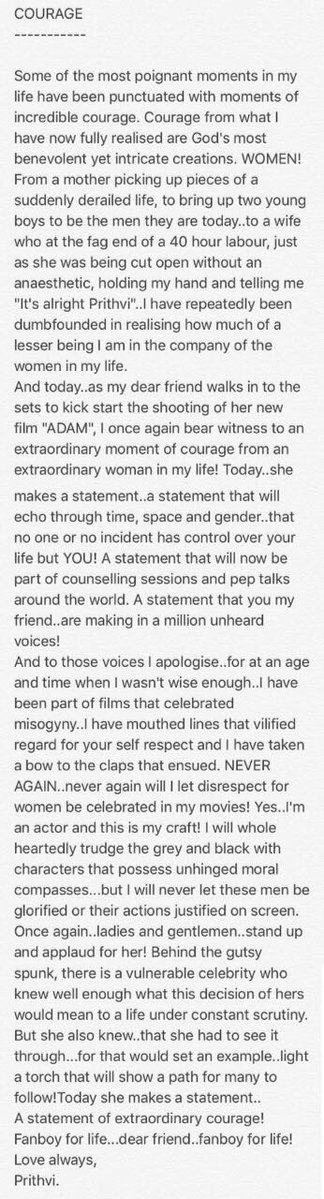 ஆகவே அனைவரும் பாவனாவின் துணிச்சலுக்கு எழுந்து நின்று கைதட்டுங்கள். அவரது துணிச்சல் இனிவரும் காலங்களில் இதே போன்ற ஒரு நிலையை சந்திப்பவர்களுக்கு எடுத்துகாட்டாக இருக்கும். அவர் துணிச்சல் மிக்கவர் என்பதை நிரூபணம் செய்துள்ளார். என் அன்புத்தோழியே உங்களுக்கு நான் வாழ்நாள் முழுவதும் ரசிகனாக இருப்பேன். இவ்வாறு நடிகர் பிரித்விராஜ் தனது சமூக வலைத்தளத்தில் தெரிவித்துள்ளார்.
