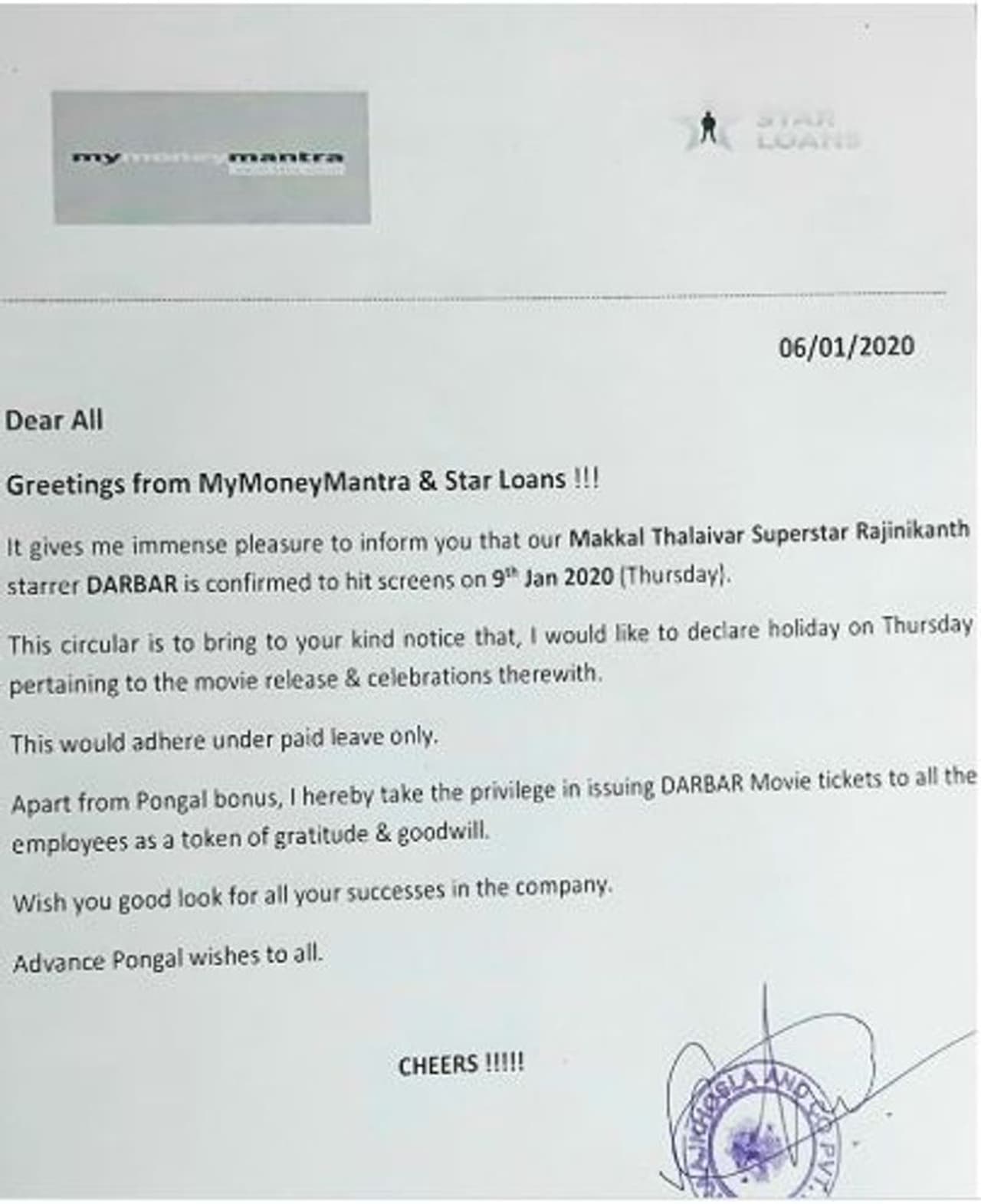 அதே போல், இந்த பொங்கல் திருவிழாவை முன்னிட்டு வெளியாக உள்ள, 'தர்பார்' படத்திற்கும் ஒரு தனியார் நிறுவனம் ஊதியத்தோடு கூடிய விடுமுறை அளித்து, ஊழியர்களை குஷிப்படுத்தியுள்ளது.