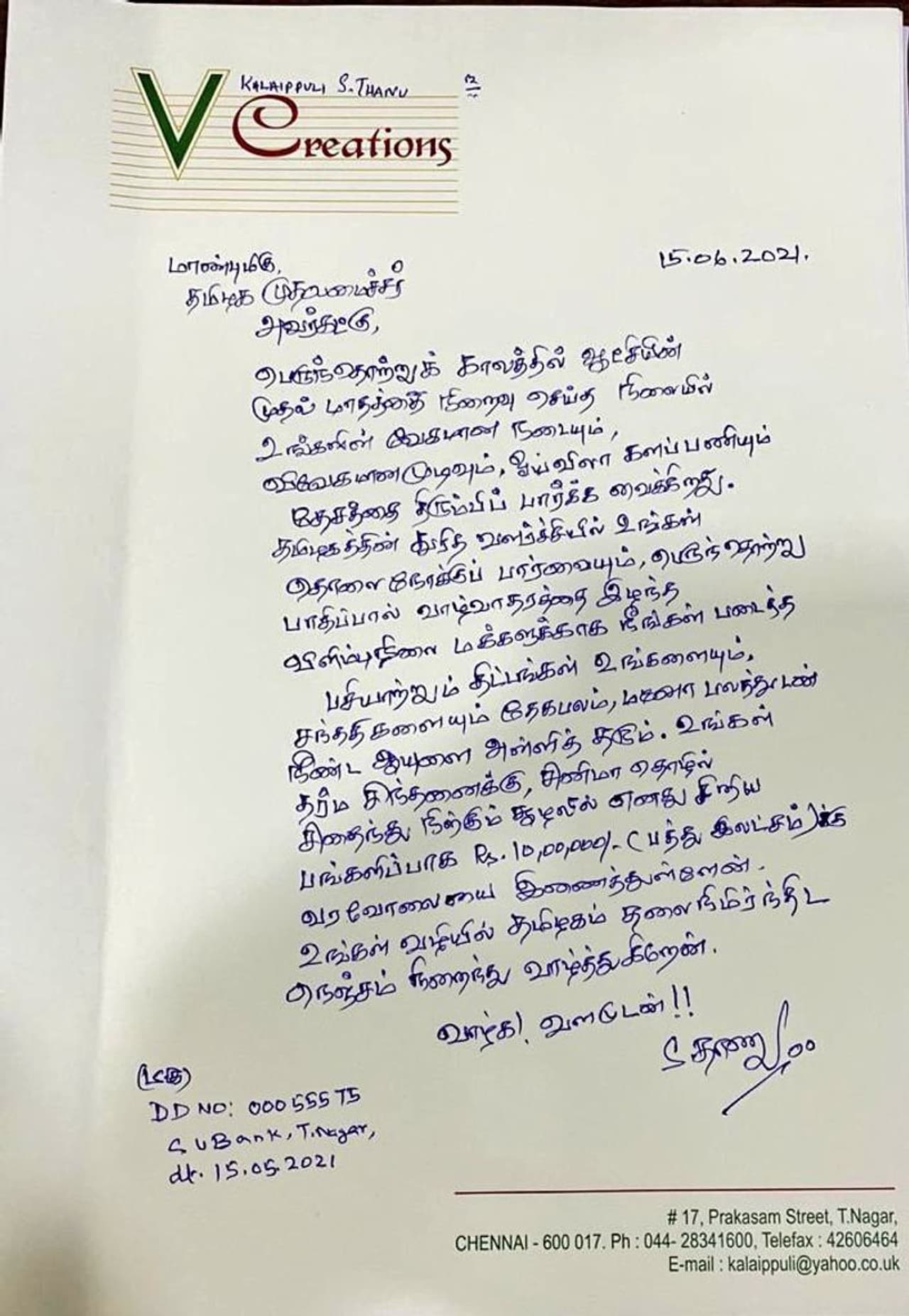 இதுகுறித்து அவர் வெளியிட்டுள்ள அறிக்கையில் கூறியுள்ளதாவது... "பெருந்தொற்று காலத்தில் ஆட்சியில் முதல் மாதத்தை நிறைவு செய்த நிலையில் உங்களின் வேகமான நடையும், விவேகமான முடிவும், ஓய்வில்லா களப்பணியும் தேசத்தை திரும்பிப் பார்க்க வைக்கிறது. தமிழகத்தின் துரித வளர்ச்சியில் உங்கள் தொலைநோக்குப் பார்வையும், பெருந்தொற்று பாதிப்பால் வாழ்வாதாரத்தை இழந்த விளிம்பு நிலை மக்களுக்கு நீங்கள் படைத்த பசியாற்றும் திட்டங்கள் உங்களையும், சந்ததிகளையும் தேகபலம், மனோபலத்துடன் நீண்ட ஆயுளை அளித்து தரும். உங்கள் தர்ம சிந்தனைக்கு, சினிமா தொழில் சிதைந்து நிற்கும் சூழலில் எனது சிறிய பங்களிப்பாக ரூபாய் 10 லட்சத்துக்கான வரைவோலையை இணைத்து உள்ளேன். உங்கள் வழியில் தமிழகம் தலைநிமிர்ந்து நெஞ்சம் நிறைந்து வாழ்த்துகிறேன்’ என்று குறிப்பிட்டுள்ளார்".