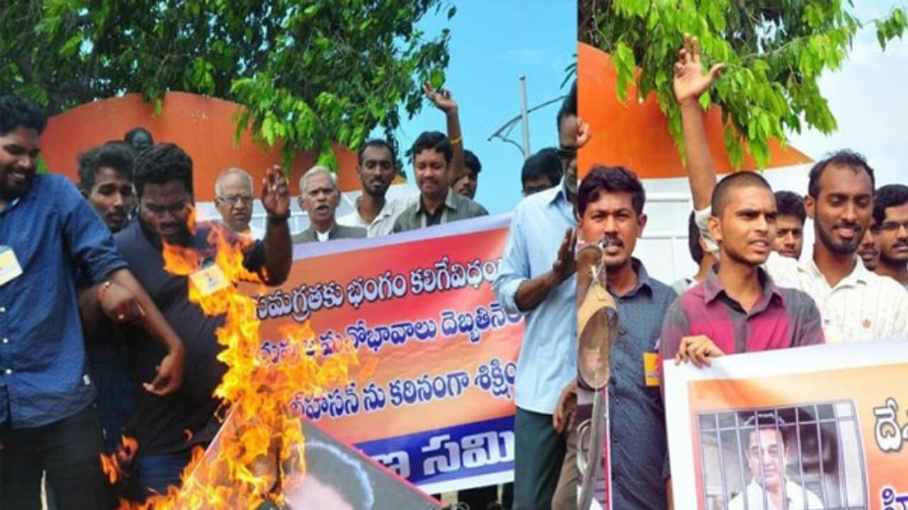 இந்நிலையில் ஆந்திர மாநிலம் விசாகப்பட்டனத்தில் ஜனா ஜகாரானா சமிதி என்ற அமைப்பு சார்பில் நடிகர் கமல்ஹாசனை கண்டித்து போராட்டம் நடைபெற்றது. இந்த போராட்டத்தின்போது நடிகர் கமலஹாசன் உருவப்படத்தை எரித்தனர்.