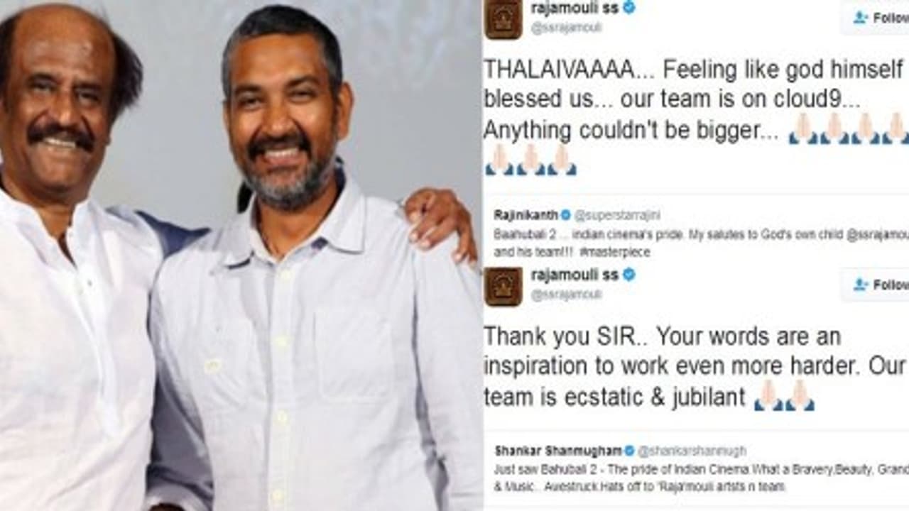 ரஜினியின் ட்வீட் மேற்கோளிட்டு 'தலைவா... கடவுளே வாழ்த்தியதுபோல் உணர்கிறேன்' என்றார் இயக்குநர் ராஜமெளலி ஒட்டுமொத்த குழுவும் பெருமகிழ்ச்சியில் இருக்கிறது. இதைவிட சிறந்த வாழ்த்து ஏதுமில்லை" என்று தெரிவித்துள்ளார்.