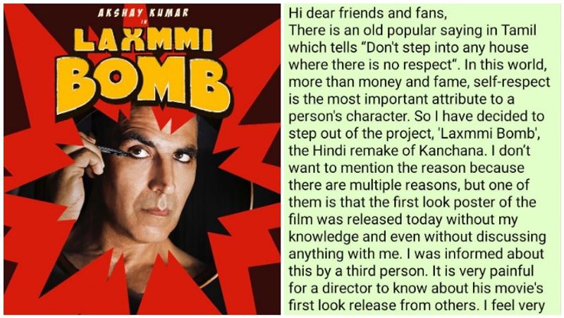 அக்ஷய் குமார், அத்வானி கியாரா, அமிதாப் நடிக்க லாரன்ஸ் இயக்கத்தில் துவங்கப்பட்ட காஞ்சனாவின் ரீமேக் ‘லக்ஷ்மி பாம்’ படத்தின் ஃபர்ஸ்ட் லுக் நேற்று வெளியிடப்பட்டது.அதை வெளியிடும் தகவலை இயக்குநர் லாரன்ஸுக்கு ஹீரோ அக்ஷய் குமாரும் தயாரிப்பாளர் தரப்பும் தெரிவிக்கவில்லை என்று தெரிகிறது. அதை ஒரு இயக்குநருக்கு நடந்த ஆகப் பெரிய அவமானமாகக் கருதிய லாரன்ஸ் தனது ட்விட்டர் பக்கத்தில்,...’நண்பர்களே மதியாதார் வாசல் மிதியாதே’ என்பது தமிழனின் பழமொழி. ‘லக்ஷ்மி பாம்’ படப்பிடிப்பில் எனக்கு அது நடந்துவிட்டது.எனவே தன்மானமே முக்கியம் என்று கருதி இப்படத்தை விட்டு வெளியேறுகிறேன்.