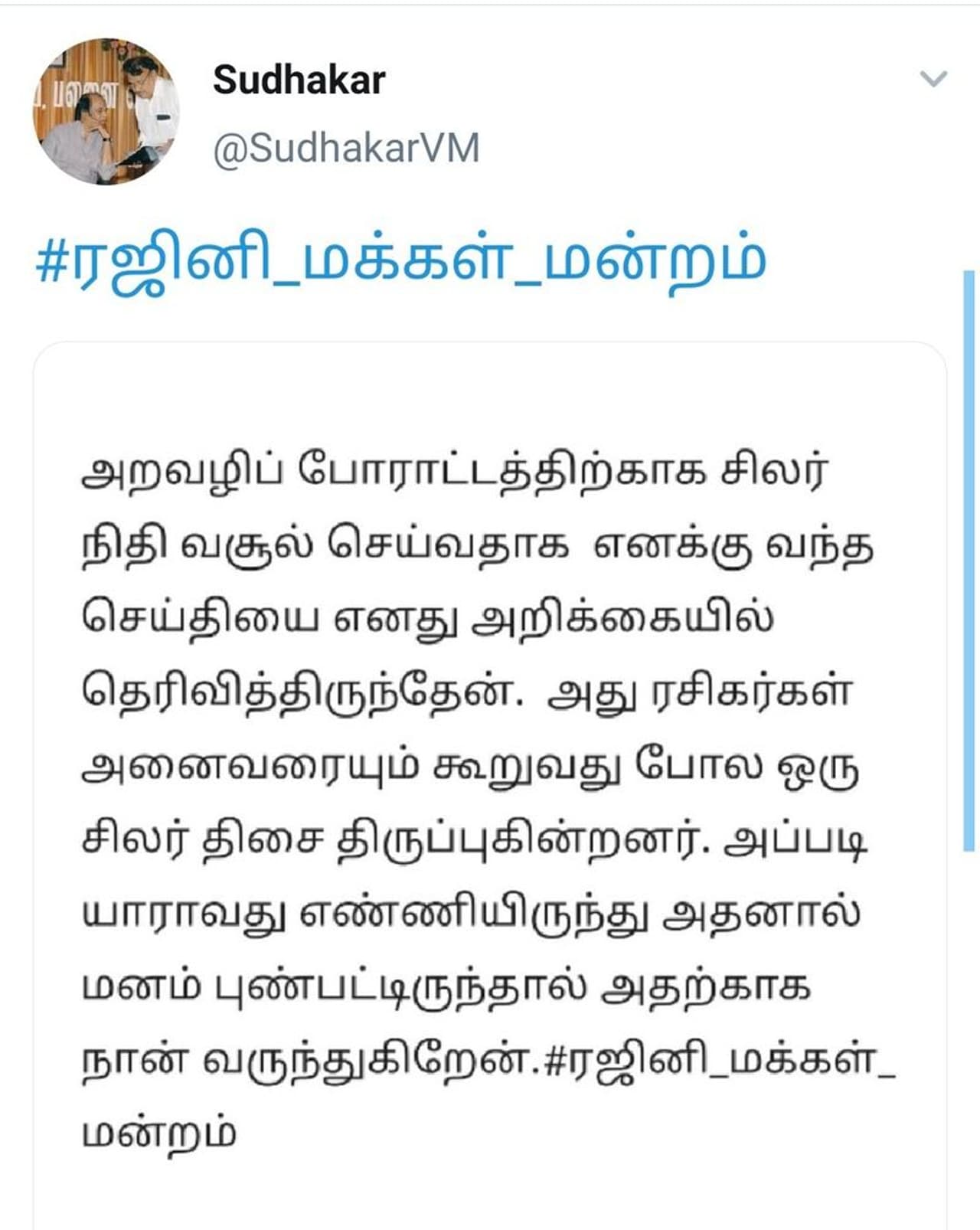 இந்த போராட்டத்திற்கு ஒரு சிலர் அதற்கான செலவுகளுக்கு என்று கூறி நிதி வசூல் செய்வதாகவும் தகவல்கள் வெளியாகி உள்ளது. இது மிகவும் வருத்தம் அளிக்கிறது. தலைவர் மீது அன்பும் அவர் நலனில் அக்கறையும் கொண்ட ரஜினி ரசிகர் மன்ற காவலர்களும், ரசிகர்களும் இதுபோன்ற செயல்களில் ஈடுபட வேண்டாம் என்று தலைமை ரஜினி மக்கள் மன்றம் சார்பில் கேட்டுக்கொள்கிறோம் எனக்குறிப்பிட்டார். பணம் வசூலிப்பதாக மக்கள் மன்றத்தினர் மீது சுதாகர் குற்றச்சாட்டியது பலரையும் வருத்தத்தில் ஆழ்த்தியது. இதையடுத்து அவர் மீது கடும் விமர்சனங்களை ரசிகர்கள் முன்வைத்தனர்.