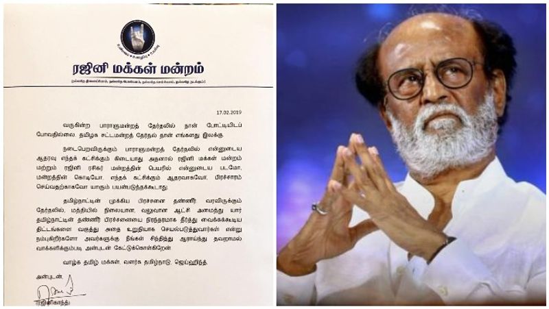 வருகின்ற நாடாளுமன்றத் தேர்தலில் என் ஆதரவு எந்தக் கட்சிக்கும் இல்லை. ஆகையால் எனது பெயரையோ படங்களையோ எந்தக் கட்சியினரும் பயன்படுத்தக்கூடாது. வருகின்ற பாராளுமன்றத் தேர்தலில் தமிழ்நாட்டின் முக்கியப்பிரச்சினையான தண்ணீர்ப் பிரச்சினையை யார் தீர்த்துவைப்பார்கள், யார் நிலையான ஆட்சியைத் தருவார்கள் என்று நம்புகிறீர்களோ அவர்களுக்கு வாக்களியுங்கள்’ என்று அறிவித்துள்ளார்.