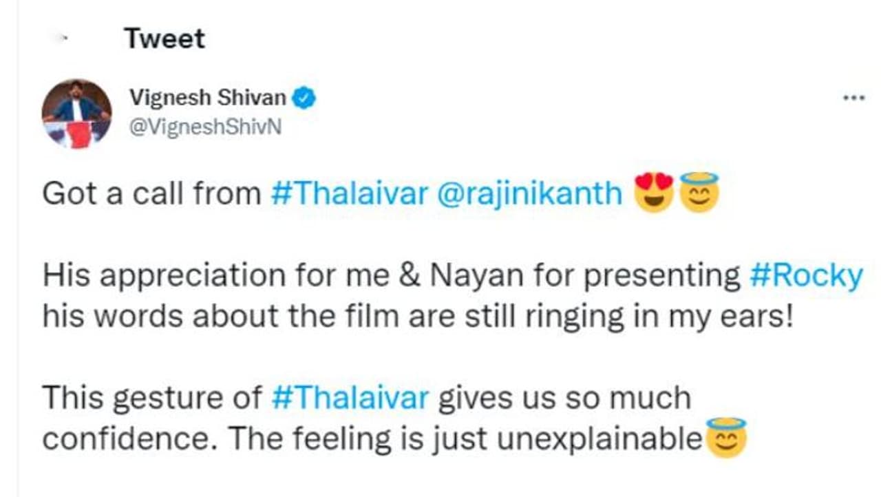 இந்நிலையில், இப்படத்தை ரவுடி பிக்சர்ஸ் சார்பாக வெளியிட்ட விக்னேஷ் சிவனை தொலைபேசியில் தொடர்புகொண்டு வாழ்த்தி உள்ளார் ரஜினி. இந்த மகிழ்ச்சியான தருணம் குறித்து விக்னேஷ் சிவன் டுவிட்டரில் பதிவிட்டுள்ளதாவது: தலைவர் ரஜினிகாந்திடம் இருந்து அழைப்பு வந்தது. ராக்கி படத்தை வெளியிட்டதற்காக என்னையும், நயன்தாராவையும் பாராட்டி அவர் சொன்ன ஒவ்வொரு வார்த்தைகளும் எனது காதில் ஒலித்துக் கொண்டே இருக்கிறது. தலைவரின் பேசியது எங்களுக்கு மிகுந்த பலமாக அமைந்தது. இந்த உணர்வுகளை வார்த்தைகளால் விவரிக்க முடியாது” என்று குறிப்பிட்டுள்ளார்.