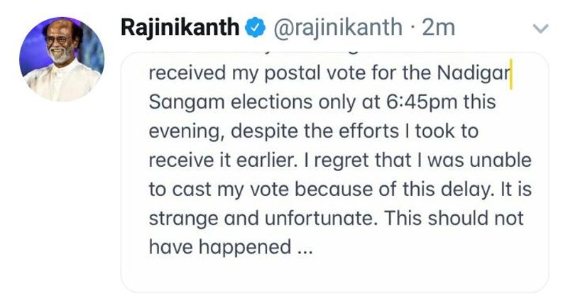 இந்நிலையில் நடிகர் ரஜினிகாந்த் டுவிட்டர் பக்கத்தில் மும்பையில் படப்பிடிப்பில் உள்ள நிலையில் நடிகர் சங்க தேர்தலுக்கான தபால் வாக்கு எனக்கு தாமதமாக கிடைத்தது.