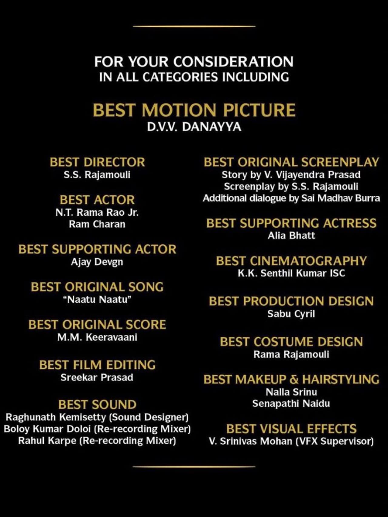 சிறந்த இயக்குநர் (ராஜமெளலி), சிறந்த நடிகர் (ஜூனியர் என்.டிஆர், ராம் சரண்), சிறந்த துணை நடிகர்(அஜய் தேவ்கன்), சிறந்த பாடல் ( நாட்டு நாட்டு), சிறந்த பின்னணி இசை (கீரவாணி), சிறந்த பட தொப்பாளர் (ஸ்ரீகர் பிரசாத்), சிறந்த ஒலி அமைப்பு (ரகுநாத் கெமிசெட்டி, போலோ குமார் டோலாய், ராகுல் கர்பே), சிறந்த திரைக்கதை ( விஜயேந்திர பிரசாத், ராஜமெளலி, சாய் மாதவ்), சிறந்த துணை நடிகை ( ஆலியா பட்), சிறந்த ஒளிப்பதிவு ( செந்தில் குமார்), சிறந்த தயாரிப்பு (சபு சிரில்), சிறந்த ஆடை அமைப்பாளர் ( ராம ராஜமெளலி), சிறந்த சிகை அலங்காரம் மற்றும் ஒப்பணையாளர் (நல்ல ஸ்ரீனு, சேனாபதி ), சிறந்த காட்சி அமைப்பு (ஸ்ரீனிவாஸ் மோகன்) ஆகிய பிரிவுகளின் கீழ் பக்கா பிளான் போட்டு மீண்டும் ஆஸ்கர் ரேஸில் இறங்கியுள்ளது 'ஆர் ஆர் ஆர்'. மேலும் ரசிகர்களும் விருதுகளை குவிக்க வாழ்த்துக்களை தெரிவித்து வருகிறார்கள்.