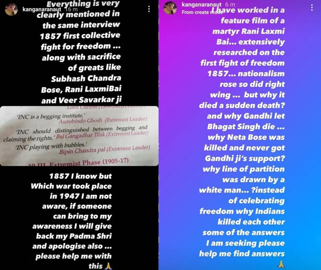 இதுகுறித்து தன்னுடைய இன்ஸ்டாகிராம் ஸ்டோரியில் கங்கனா பதிவிட்டுள்ளதாவது... "நான் அந்த நிகழ்ச்சியில் பேசிய போது மிகவும் தெளிவாக குறிப்பிட்டுள்ளேன், சுபாஷ் சந்திரபோஸ், ராணி லக்ஷ்மிபாய் மற்றும் வீர் சாவர்க்கர் ஜி போன்ற தலைவர்களின் தியாகத்துடன், 1857-ஆம் ஆண்டு சுதந்திரத்திற்கான முதல் கூட்டுப் போராட்டம் குறித்து. 1857 ஆம் ஆண்டு நடந்த போராட்டம் பற்றி எனக்கு நன்றாக தெரியும். ஆனால் 1947-ல் எந்தப் போர் நடந்தது. 1947-ல் யாராவது போராட்டம் நடத்தியிருந்தால் சொல்லுங்கள், நான் என்னுடைய பத்மஸ்ரீ விருதை திருப்பி கொடுத்துவிட்டு மன்னிப்பையும் கேட்கிறேன்.