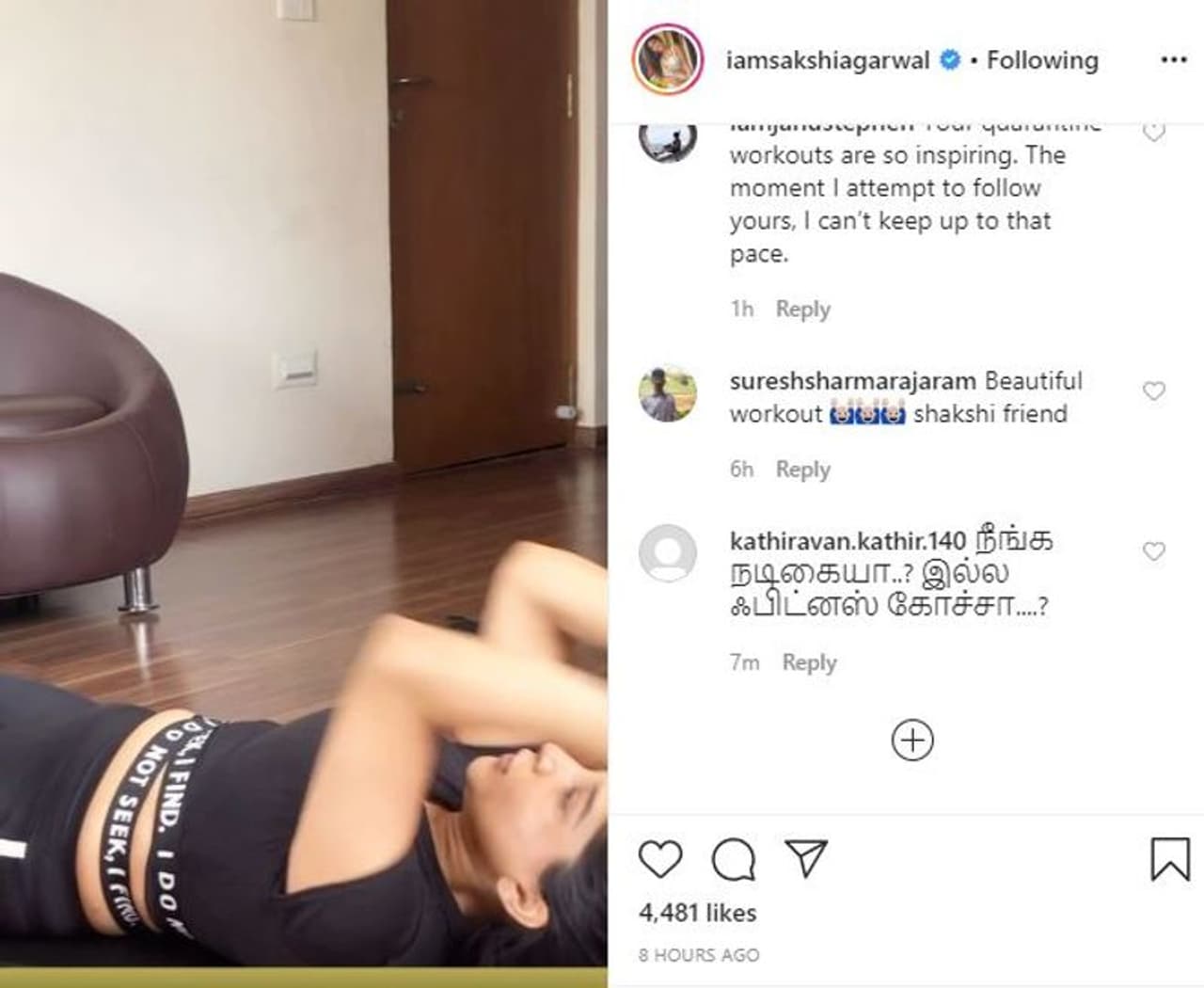 லாக்டவுன் நேரத்தில் கிளுகிளுப்பு போட்டோக்களை மட்டுமல்ல பிட்னஸில் அக்கறை உள்ள சாக்ஷி உடற்பயிற்சி வீடியோக்கள் மட்டும் போட்டோக்களையும் பகிர்ந்து வருகிறார்.