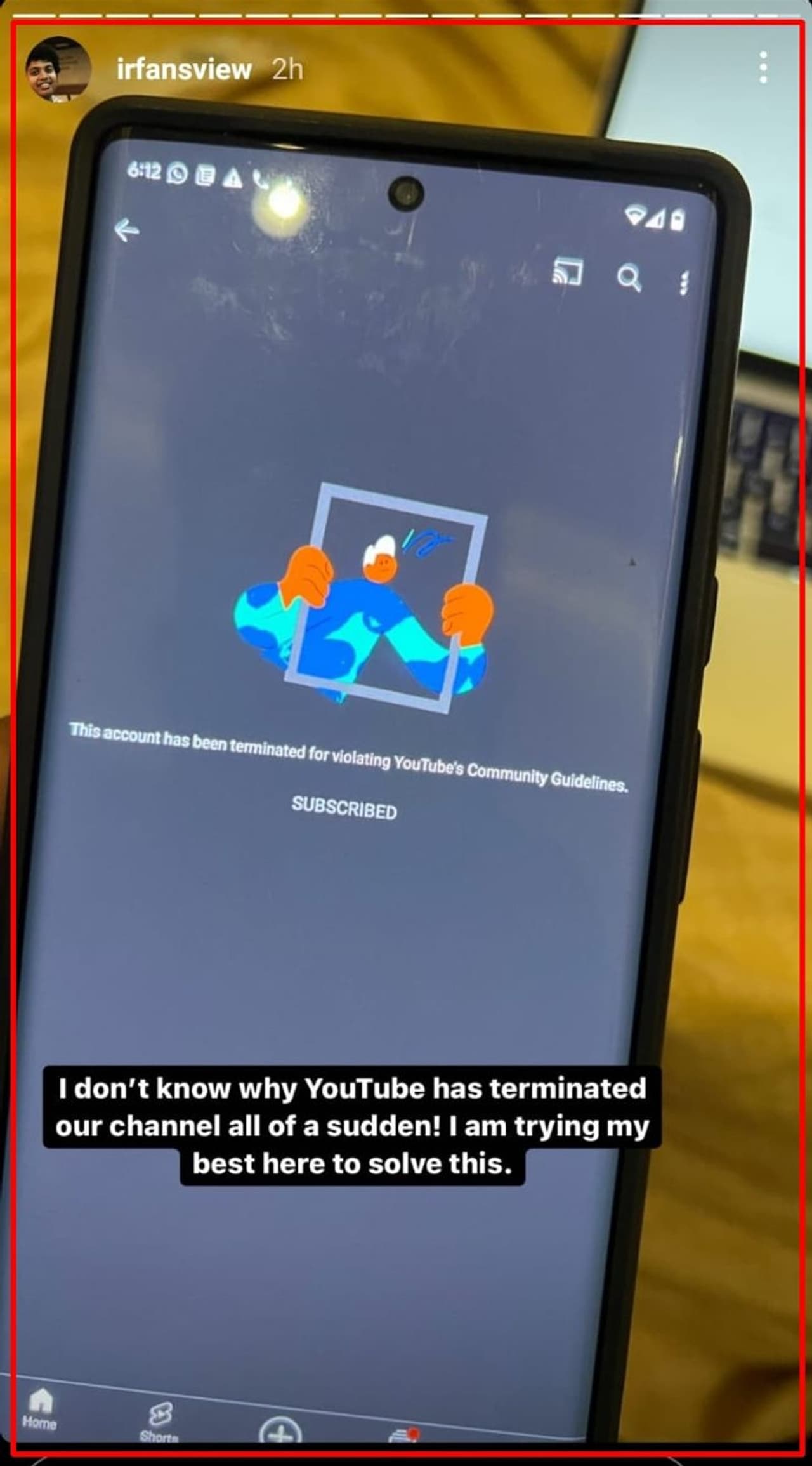 Irfan's view யூடியூப் சேனலை 20 லட்சத்துக்கும் அதிகமானோர் பின் தொடர்ந்து வந்தனர். அவர்களை கவரும் விதமாக தினந்தோறும் வீடியோ பதிவிட்டு வந்தா இர்பான். இந்நிலையில், நேற்று Irfan's view யூடியூப் சேனல் திடீரென முடக்கப்பட்டது. இதனால் அதிர்ச்சி அடைந்த ரசிகர்கள், இர்பானிடம் அதற்கான காரணத்தை கேட்டு வந்தனர்.