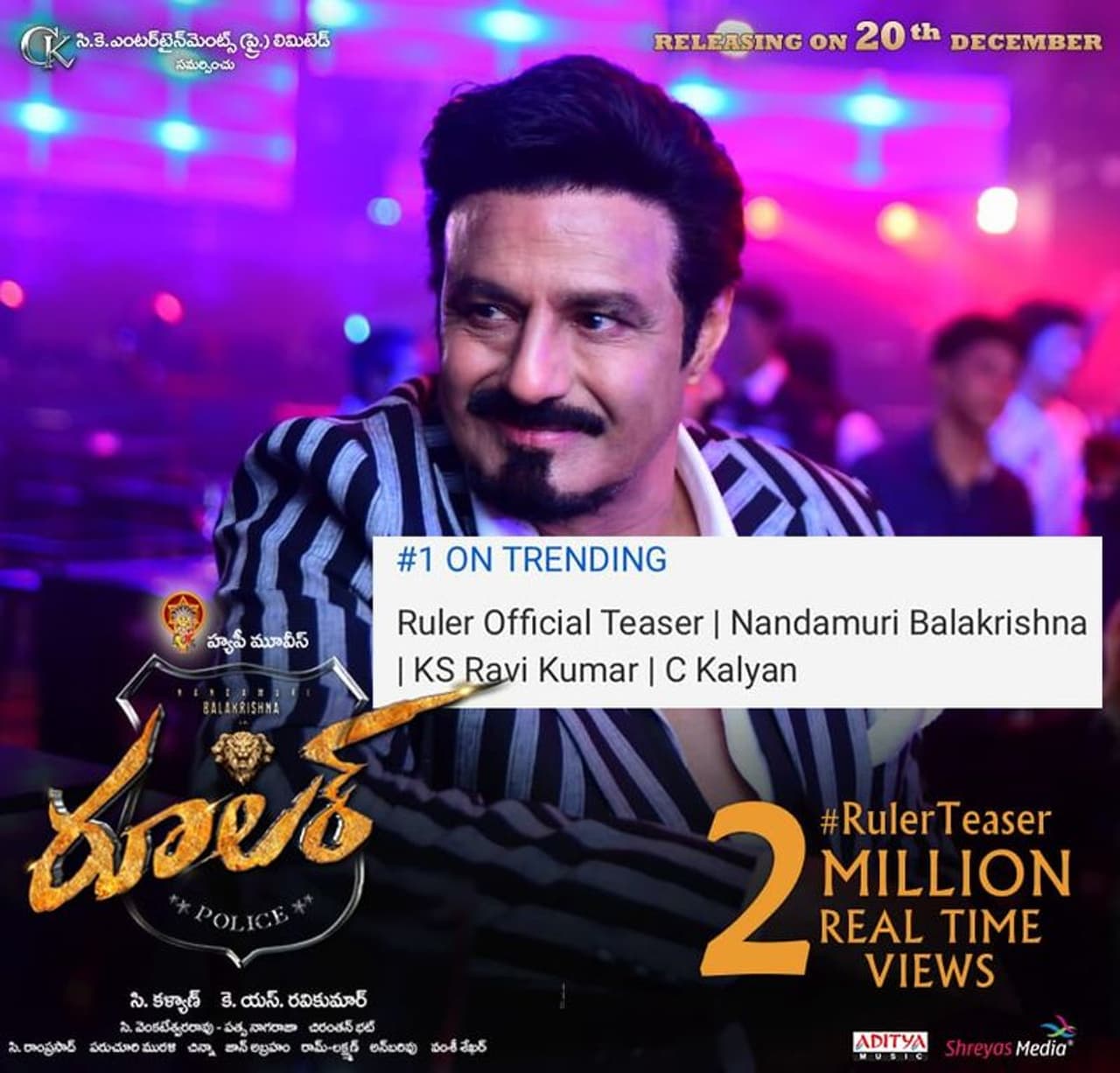 இதையடுத்து "ரூலர்" படத்தின் டீசரை நேற்று படக்குழுவினர் வெளியிட்டனர். சிங்கம் போல கர்ஜிக்கும் தர்மா என்ற போலீஸ் அதிகாரியாக பாலகிருஷ்ணா மாஸ் காட்டியிருந்தார். வழக்கமான பாலகிருஷ்ணா பட பாணியில் அனல் பறக்கும் சண்டை காட்சிகள், மாஸ் பஞ்ச் டைலாக்குகள், கொலைவெறி வில்லன்கள், ஹாட் லவ் சாங்க்ஸ் என அனைத்து அம்சங்களும் ரசிகர்களை வெகுவாக கவர்ந்துள்ளது. அதனால் தானோ என்னவோ ஒரே நாளில் "ரூலர்" பட டீசரை 2 மில்லியனுக்கும் மேற்பட்ட பார்வையாளர்கள் கண்டு ரசித்துள்ளனர். இதனால் இந்திய அளவில் யூ-டியூப் ட்ரெண்டிங்கில் "ரூலர்" பட டீசர் முதலிடம் பிடித்துள்ளது. வெற லெவலில் வெறித்தனம் காட்டியுள்ள ரூலர் திரைப்படத்தை அடுத்த மாதம் 20ம் தேதி ரிலீஸ் செய்ய படக்குழு திட்டமிட்டுள்ளது.