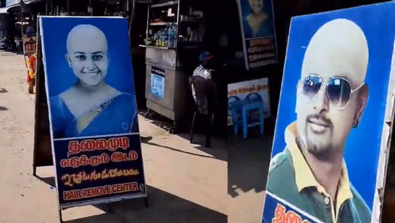 தமிழ் சினிமா நடிகர், நடிகைகளின் தலையை மொட்டை அடித்தது போல் எடிட் செய்து சலூன் கடைக்காரர் ஒருவர் தனது கடையின் விளம்பரத்துக்காக வைத்துள்ள வீடியோ சமூக வலைதளங்களில் வைரலாக பரவி வருகிறது.