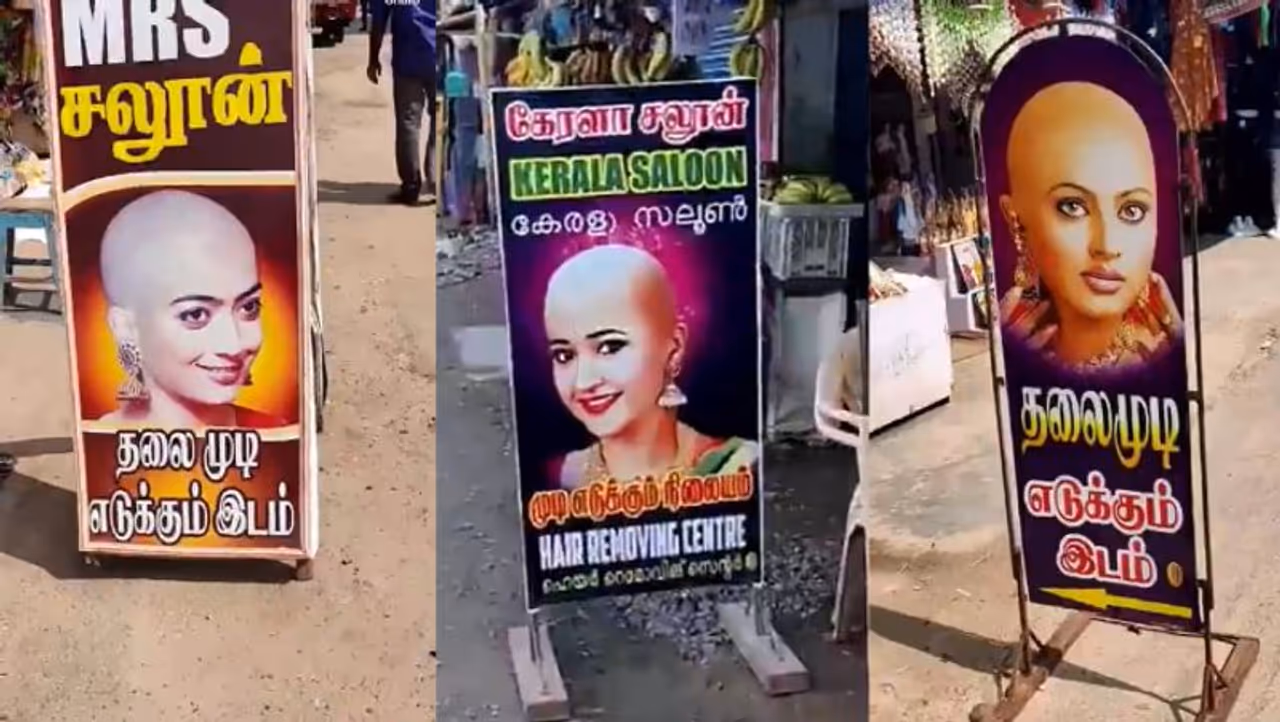 ஆனால் தற்போது வைரலாகி வரும் வீடியோ ஒன்றில் சலூன் கடைக்காரர் ஒருவர் தனது கடையை விளம்பரப்படுத்தும் நோக்கில், சிவகார்த்திகேயன், நடிகைகள் ஸ்ரீதிவ்யா, பூனம் பஜ்வா, சினேகா, ராஷ்மிகா மந்தனா ஆகியோரின் புகைப்படத்தை மொட்டை தலையுடன் இருக்கும்படி எடிட் செய்து பேனராக வைத்துள்ளார்.