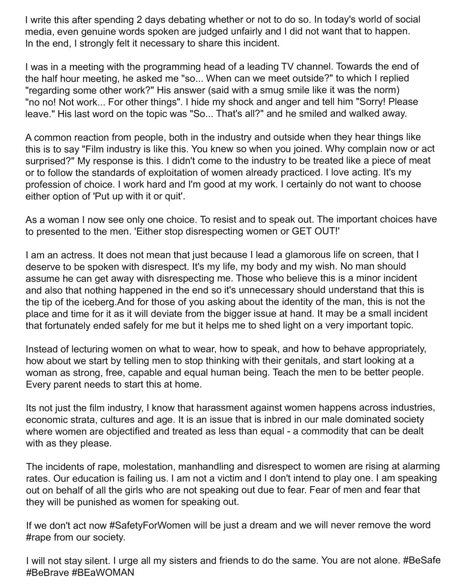இதில் அவர் கூறியுள்ளது இரண்டு நாட்களாக நடந்த விஷயங்களை பார்த்தேன். நானும் இந்த தொல்லைகளை சந்தித்திருக்கிறேன் என்றும். ஒருமுறை நான் முன்னனி டி.வி. சேனல் அதிகாரியுடன் மீட்டிங்கில் இருந்தேன்.