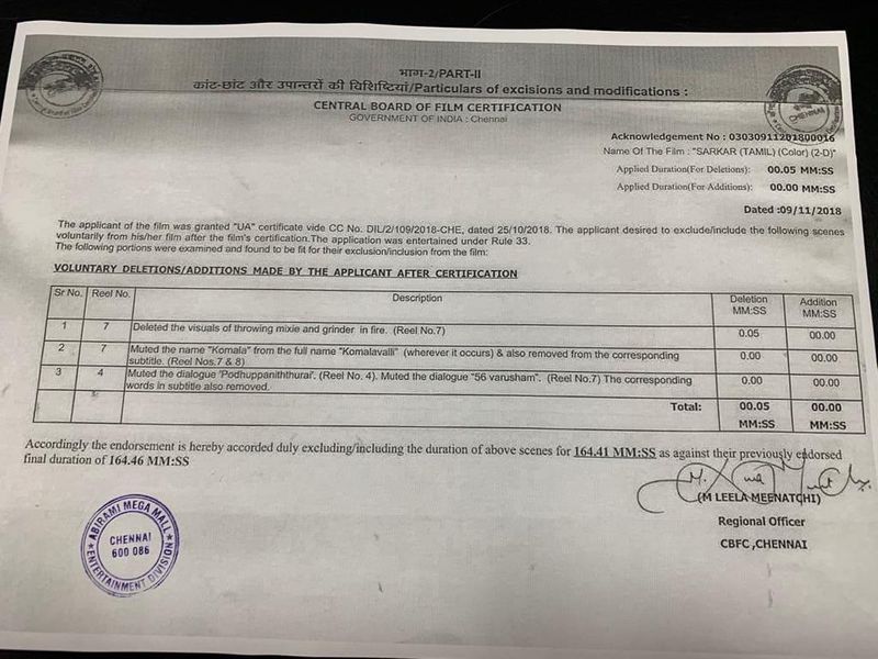 பின்னர், பல திரை அரங்குகளில் ஏற்பட்ட வன்முறை காரணமாக காட்சிகள் ரத்து செய்யப்பட்டு படத்தில் சில காட்சிகள் நீக்கபடும் என திரையரங்க உரிமையாளர் சங்கம் தெரிவித்து இருந்தது. இதனை தொடர்ந்து இன்று காலை 10.30 மணிக்கு தொடங்கப்பட்ட எடிட்டிங், மதிய வேளையில் முடிவு பெற்று தற்போது எந்தெந்த காட்சிகள் நீக்கப்பட்டு உள்ளது என லிஸ்ட் போட்டு வெளியிட்டு உள்ளது திரையரங்க உரிமையாளர் சங்கம்