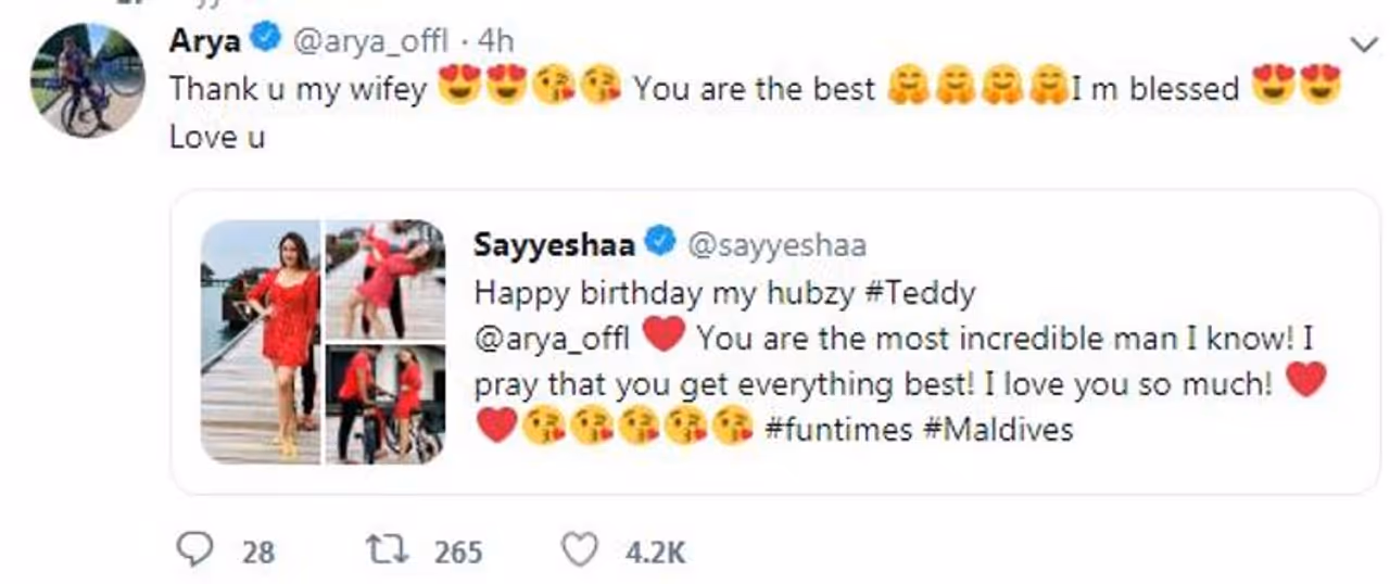 காதல் மனைவியின் பிறந்தநாள் வாழ்த்தை ரீ-ட்வீட் செய்து பதிலளித்துள்ள ஆர்யா, டேங்க் யூ மை வொய்ஃபீ... லவ் யூ... என பதிவிட்டுள்ளார். விதவிதமான போஸ்களில் ஆர்யாவும், சாயிஷாவும் ரொமான்ஸ் செய்திருக்கும் இந்த புகைப்படங்கள், ரசிகர்களின் லைக்குகளை அள்ளி வருகின்றன.