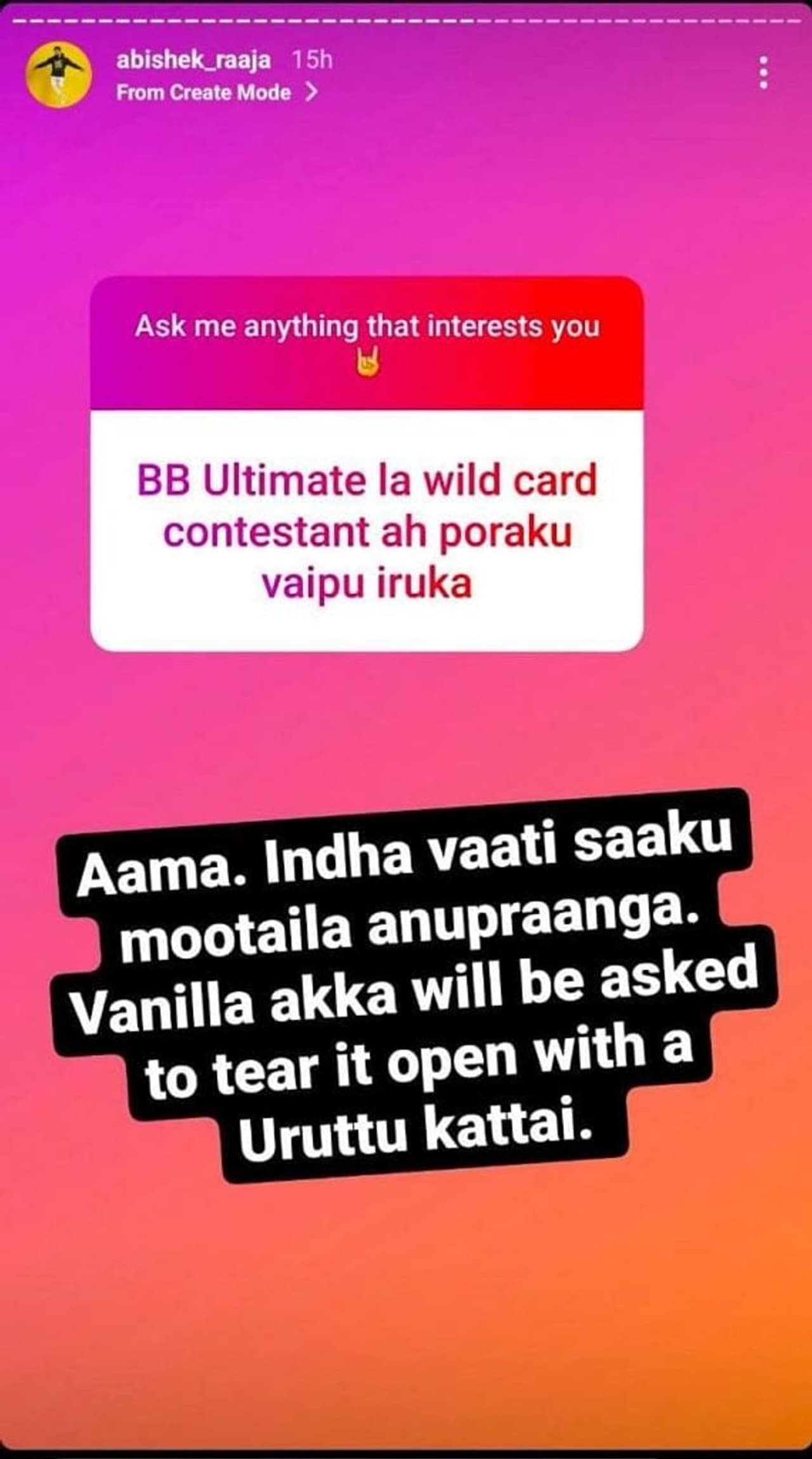 பிக் பாஸ் சீசன் 5-ல் இருந்து சர்ச்சைக்குரிய வீரர்களில் அபிஷேக் ராஜாவும் ஒருவர். இப்போது, பிக் பாஸ் அல்டிமேட்டிற்கு வந்தவுடன் அபிஷேக் மனம் திறந்துள்ளார். இன்ஸ்டாகிராம் கேள்வி பதில்அமர்வில் அபிஷேக்கின் வைல்ட் கார்டு நுழைவு பற்றி ரசிகர் ஒருவர் கேட்டதற்கு, "ஆமா. இந்த வாடி சாக்கு மூட்டைல அனுப்புங்க. வெண்ணிலா அக்காவை உருட்டு கட்டையால் கிழிக்கச் சொல்வார்கள்" என்று கிண்டலாக பதிலளித்தார். இருப்பினும் நிகழ்ச்சியின் பரபரப்பை அதிகரிக்க அபிஷேக் வைல்ட் கார்டு என்ட்ரி ஆக வாய்ப்புகள் அதிகம் என்று கூறப்படுகிறது.
