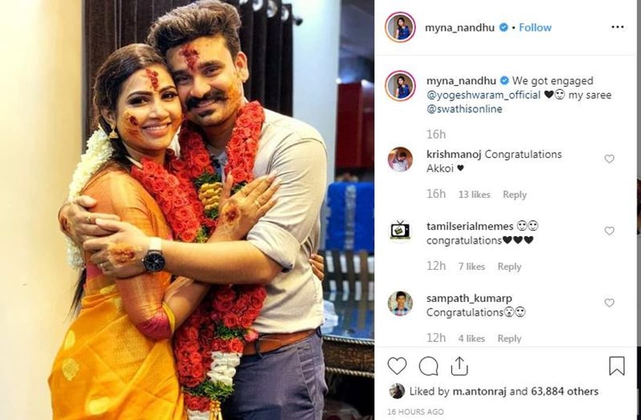 இந்நிலையில்,யோகேஸ்வரன் - 'மைனா' நந்தினி இருவரும் தங்களது இன்ஸ்டாகிராமில், பதிவு ஒன்றை எழுதியுள்ளனர். அதில், தங்களுக்கு திருமணம் நிச்சயமானதாக குறிப்பிட்டு புகைப்படங்களையும் பகிர்ந்துள்ளார். யோகேஸ்வரன் 'நாயகி', 'சத்யா' உள்ளிட்ட சீரியல்களில் நடித்தவர் என்பது குறிப்பிடத்தக்கது. முதல் திருமணம் சோகத்தில் முடிந்த நிலையில்,'மைனா' நந்தினியின் 2-வது திருமண வாழ்க்கையாவது இனிமையாக அமைய வேண்டும் என ரசிகர்கள் பலரும் வாழ்த்துக்களை தெரிவித்து வருகின்றனர்.