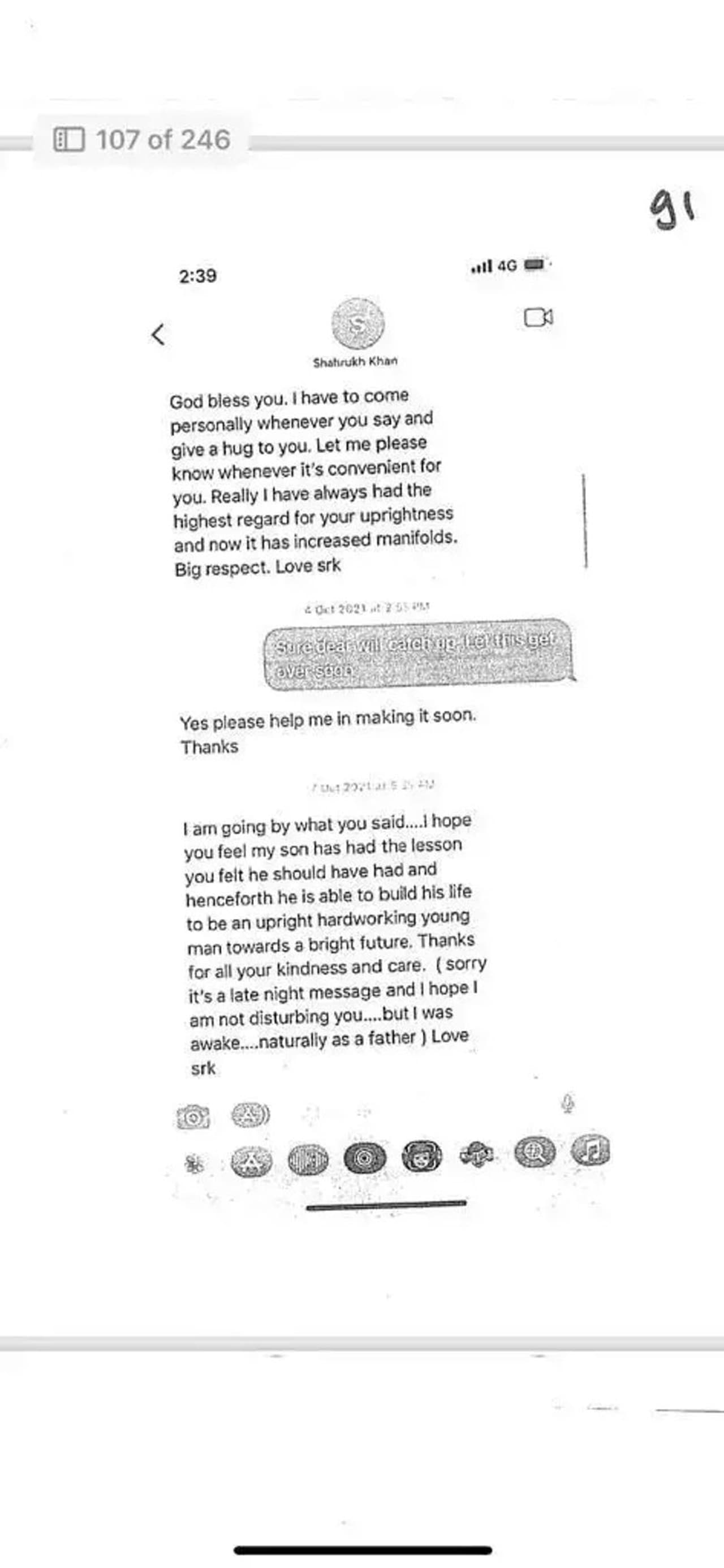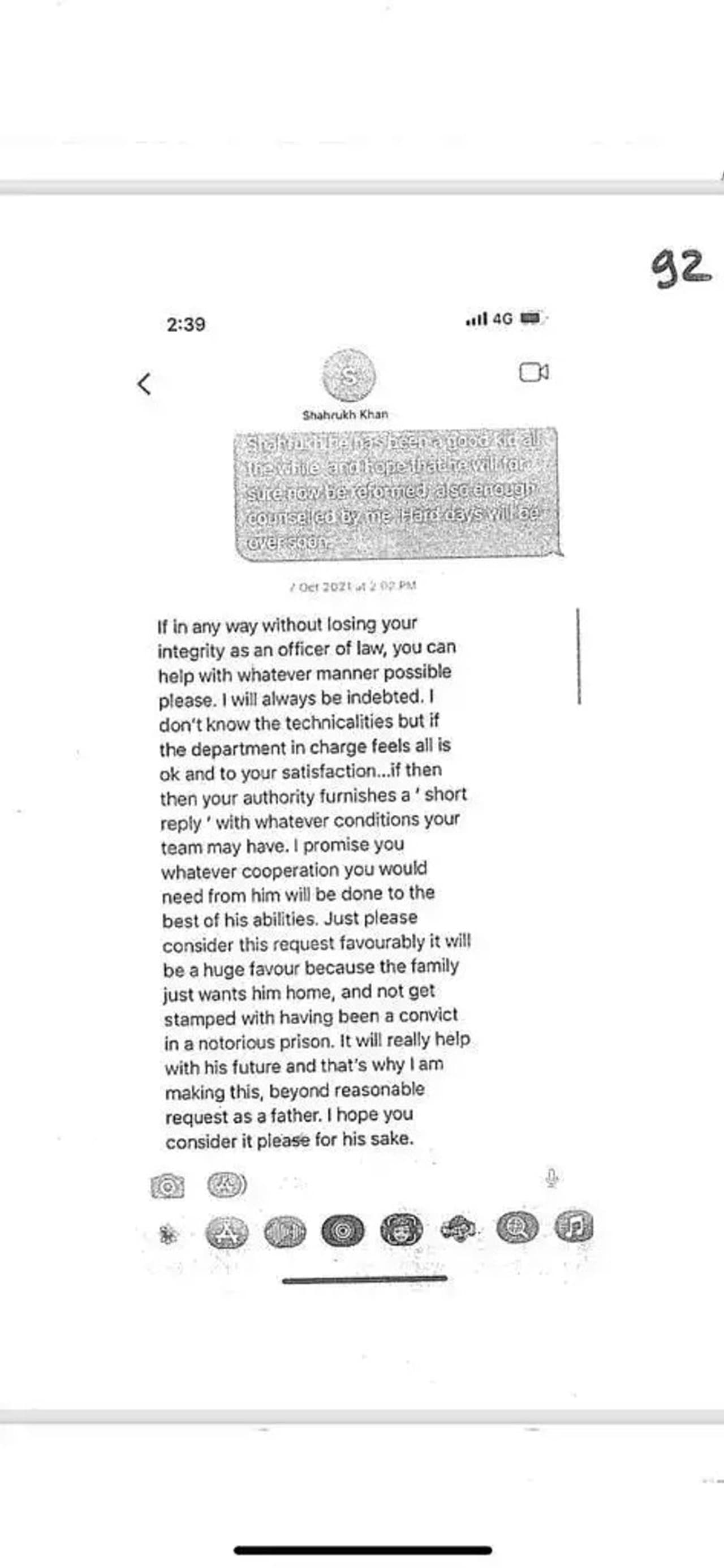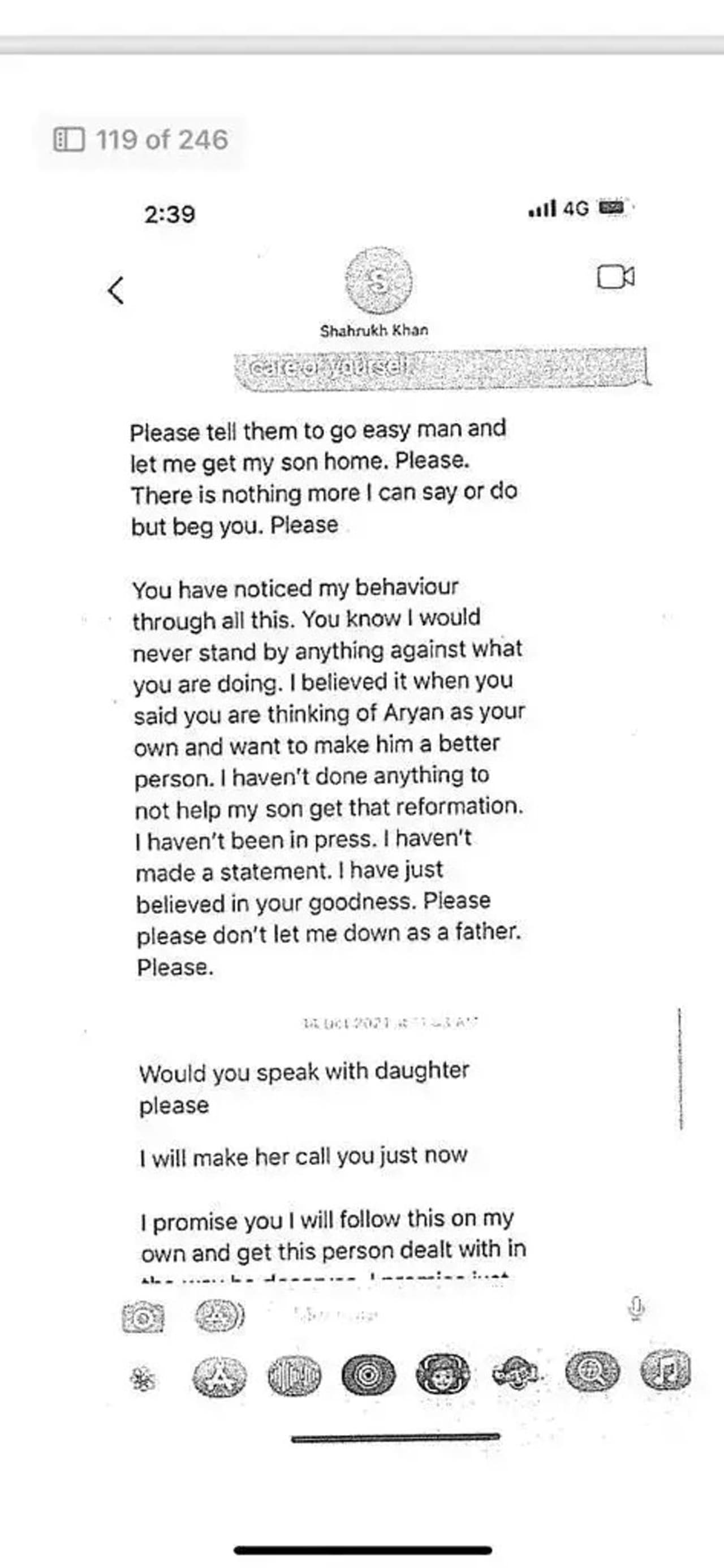 இந்த வாட்டஸ் ஆப் சேட்டிங்கில், ஷாருக்கான் சமீரிடம், "தயவுசெய்து உங்களை நான் கெஞ்சிக் கேட்டுக்கொள்கிறேன். இது ஒரு பெரிய விஷயம், என் மகனும் என் குடும்பத்திற்கும் இதில் எந்தப் பங்கும் இல்லை என்று சத்தியம் செய்வேன். இந்த சம்பவத்திற்கு பின்னர் நான் யாருடனும் பேசுவதைக் கூட தவிர்த்துவிட்டேன்" மனம் உடைந்து பேசியுள்ளார்.