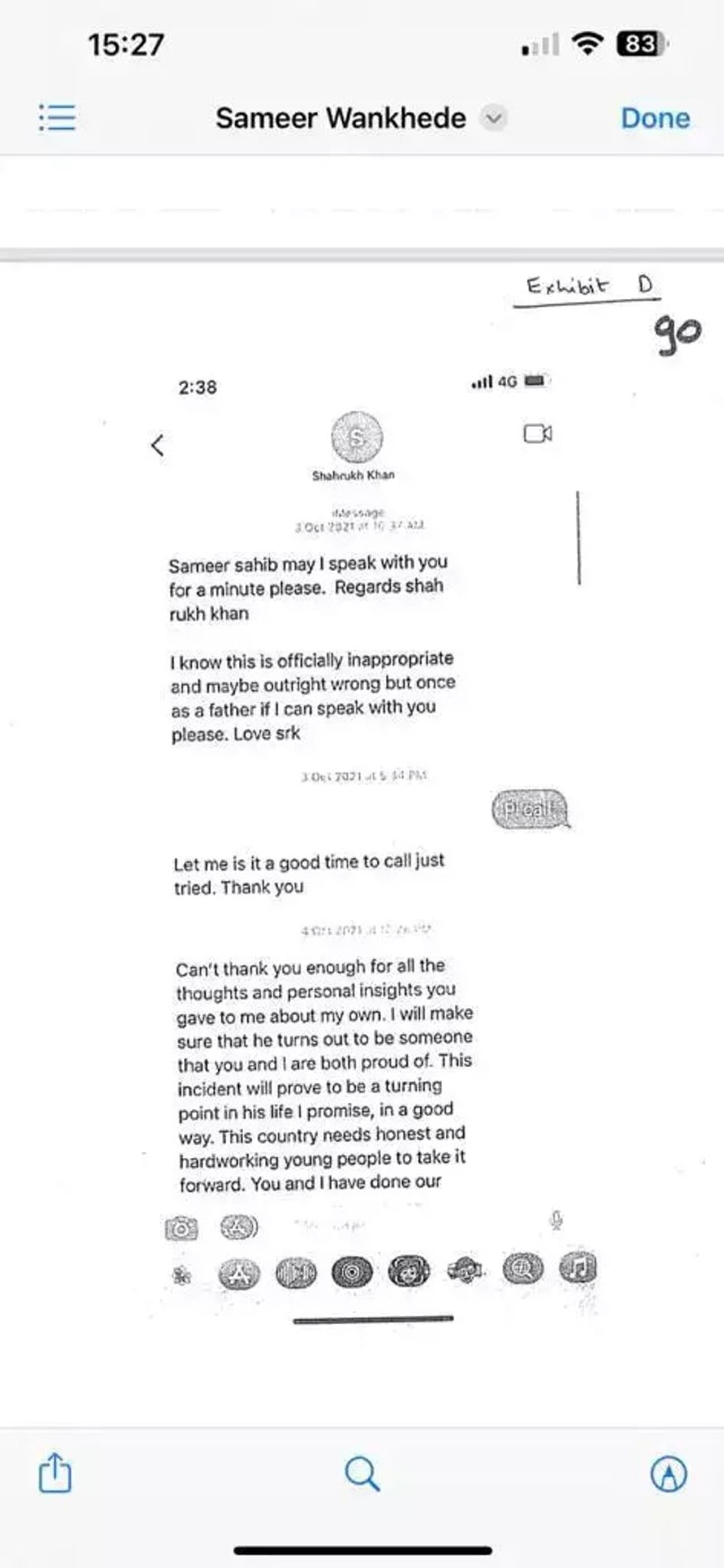 இன்று வெளியான நீதிமன்ற ஆவணத்தின்படி, நடிகர் ஷாருக்கான், தள்ளுபடி செய்யப்பட்ட தன்னுடைய மகன் போதைப்பொருள் வழக்கில் "ஆர்யன் கானிடம் மென்மையாக நடந்து கொள்ளுமாறு" முன்னாள் NCB ஊழியர் சமீர் வான்கடேவிடம் கேட்டுக்கொண்டுள்ளார். இதுகுறித்து மும்பை உயர் நீதிமன்றத்தில் வான்கடே சமர்ப்பித்த ஆவணத்தில், நடிகர் ஷாருக்கானுக்கும் அவருக்கும் இடையே நடந்த வாட்டஸ் ஆப் உரையாடலை சமர்ப்பித்துள்ளார். இதில் ஷாருக்கான் 2019 இல் மகன் ஆரியனுக்காக வான்கடேவிடம் குடும்பத்தினருக்கும் உதவுமாறு கெஞ்சுவதைக் காண முடிந்தது.