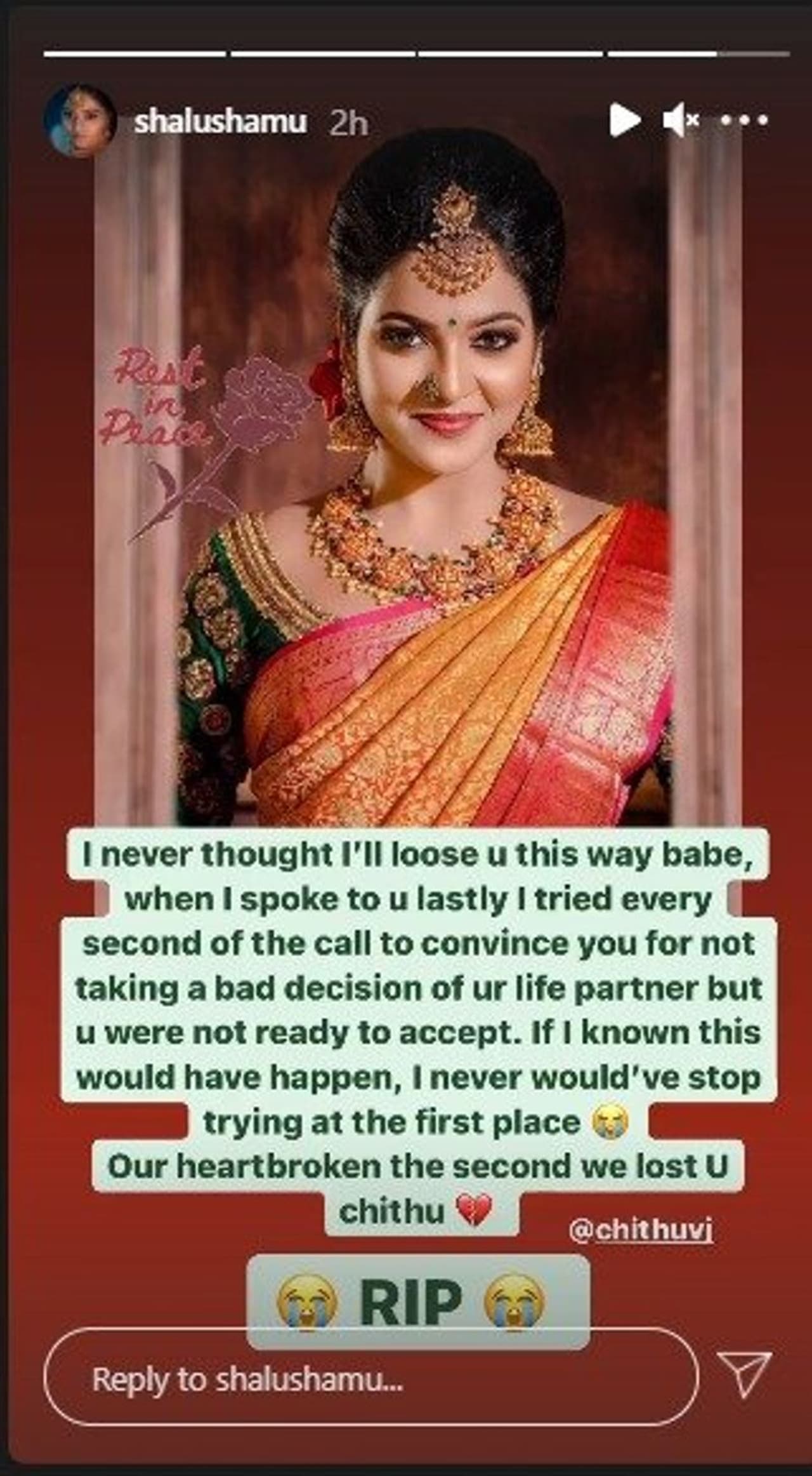 இந்நிலையில் சித்ராவிற்கு நெருக்கமான பல பிரபலங்கள் மற்றும் நண்பர்கள் தங்களுடைய இரங்கலை தெரிவித்து வரும் நிலையில் ஷாலு ஷம்மு, உன்னுடைய வாழ்க்கை துணை விஷயத்தில் நீ எடுத்த முடிவு தவறாகிவிட்டது என்று கூறி இன்ஸ்டாவில் பதிவிட்டுள்ளார்.
