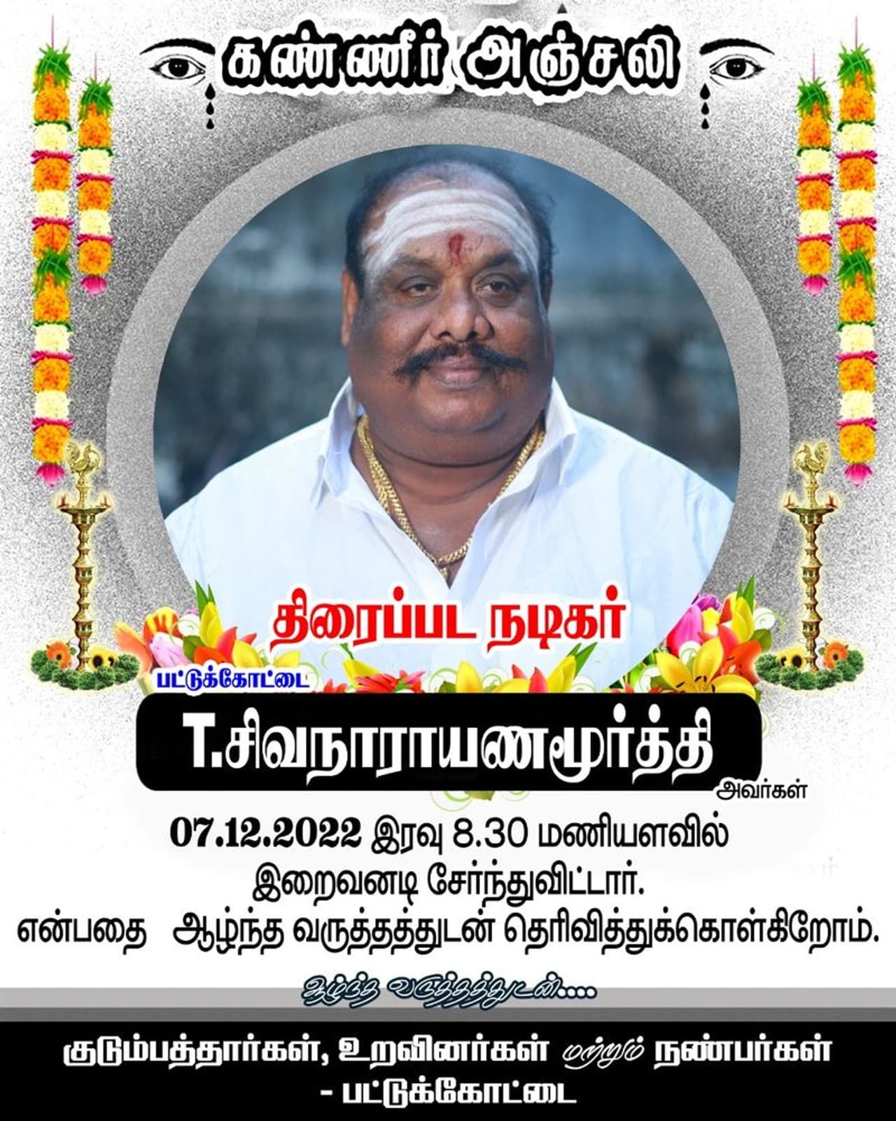 தமிழ் திரையுலகில் பல முன்னணி நடிகர்கள் படங்களில் நடித்துள்ள காமெடி நடிகர்... பட்டுக்கோட்டை T. சிவநாராயணமுர்த்தி உடல்நல குறைவால் காலமானார். இவருடைய திடீர் மரணம் தமிழ் திரையுலக ரசிகர்கள் மற்றும் பிரபலங்களை அதிர்ச்சியில் ஆழ்த்தியுள்ளது.