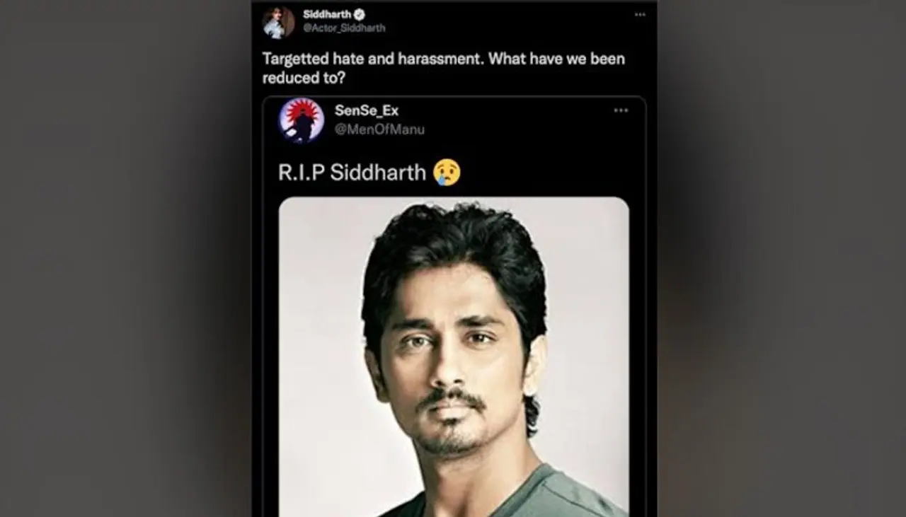 திரையுலகில் முன்னணி நட்சத்திரமாக வலம் வரும் சித்தார்த் அரசியல் ரீதியாக பல கருத்துக்களை கூறி அவ்வப்போது சிக்கலில் சிக்கிக்கொள்கிறார். அதனால் அவர் மீது கடும் விமர்சனங்களை முன்வைப்பவர்கள் ஏராளம். இந்நிலையில் சித்தார்த் இறந்துவிட்டதாக வைரலான புகைப்படம் ஒன்றை அவரே தனது ட்விட்டர் பக்கத்தில் பதிவிட்டுள்ளார்.