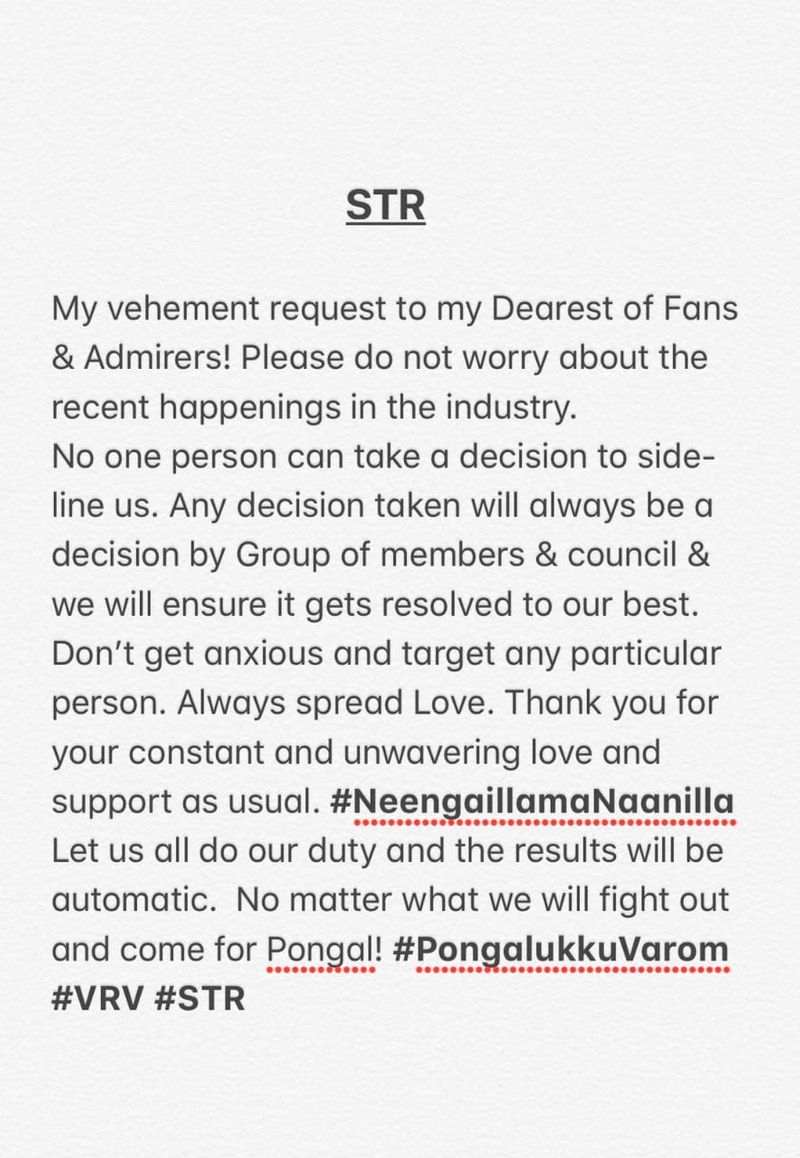 இந்நிலையில் ரசிகர்களுக்கு சிம்பு அறிக்கை ஒன்றை வெளியிட்டுள்ளார். அதில். வந்தா ராஜாவா தான் வருவேன் ரிலீஸ் பிரச்னை பற்றி கவலைப்பட வேண்டாம். எந்த ஒரு தனி மனிதரின் முடிவும் என்னை ஓரங்கட்டிவிட முடியாது. ஒரு குழுவாக, அமைப்பாக எடுக்கப்பட்ட முடிவுக்கு சரியான முறையில் தீர்வு காணப்படும். ஆத்திரத்தில் யாரும் யாரையும் புண்படுத்த வேண்டாம். அன்பை பகிருங்கள். தொடர்ச்சியாக நீங்கள் கொடுக்கும் அன்பிற்கும் ஆதரவிற்கும் நன்றி. நீங்கள் இல்லாமல் நான் இல்லை அதில் குறிப்பிட்டுள்ளார்.