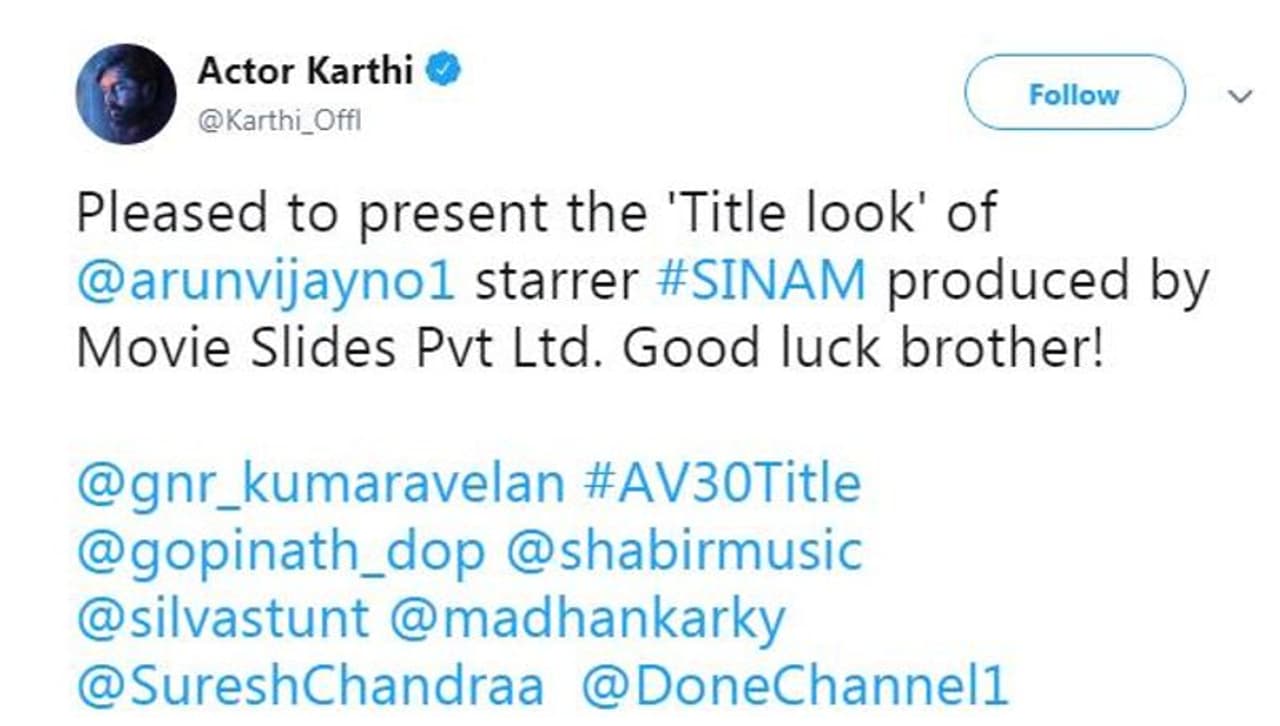 அருண் விஜய்யின் 30-வது படமாக உருவாகிவரும் இந்தப் படத்தின் தலைப்பை படக்குழு வெளியிட்டுள்ளது. 'சினம்' என தலைப்பு வைக்கப்பட்டிக்கும் இந்தப் படத்தின் டைட்டில் லுக்கை, நடிகர் கார்த்தி தனது டுவிட்டர் பக்கத்தில் வெளியிட்டு படக்குழுவுக்கு வாழ்த்து தெரிவித்துள்ளார்.
