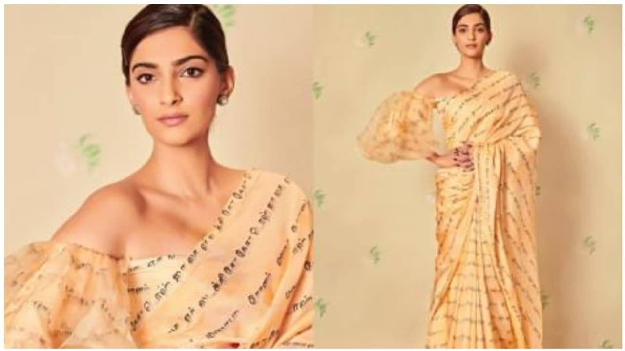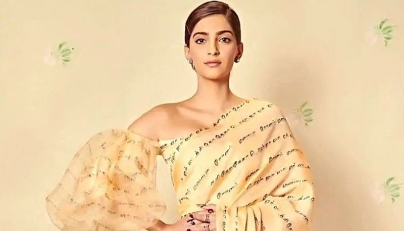இதோ போல் தற்போது பாலிவுட் நடிகை சோனம் கபூர், தான் நடித்துள்ள படத்தின் ப்ரோமோஷன் நிகழ்ச்சியில் கலந்து கொண்டார். அப்போது இந்த படத்தின் பெயர் " ஏக் லடிக்கி கோ தேகா தொ ஏசா லகா" , அவருடைய பெயர் மற்றும் மாஸபா ஆகிய வார்த்தைகளை தமிழில் எழுதப்பட்ட புடவை ஒன்றை கட்டி வந்தார்.