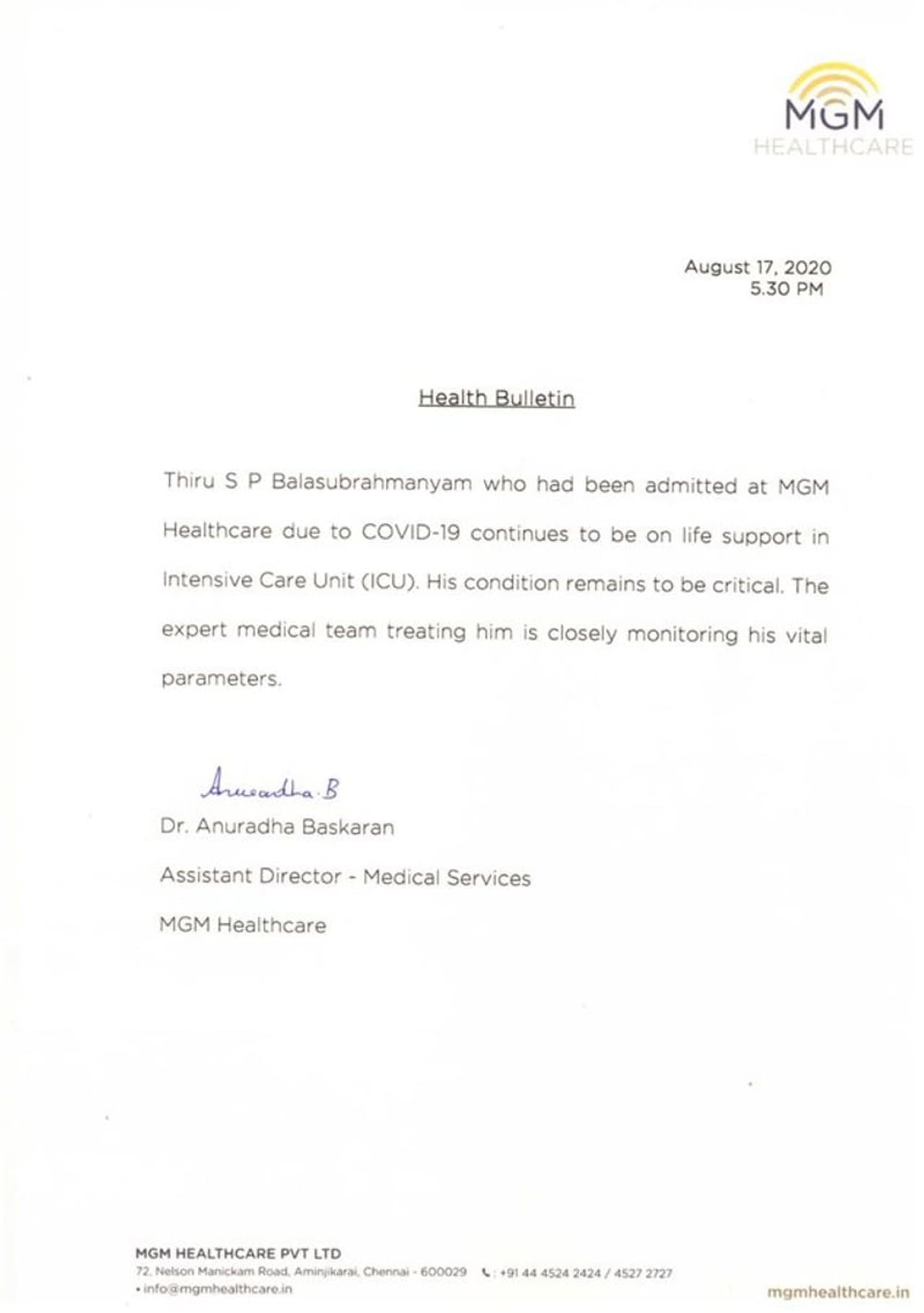 கடந்த 14ம் தேதி மருத்துவமனை வெளியிட்ட அறிக்கையில், “எஸ்.பி. பாலசுப்பிரமணியத்தின் உடல்நலம் திடீர் என்று மோசமடைந்து விட்டதாகவும், மருத்துவ நிபுணர்களின் அறிவுரையின்படி அவர் தீவிர சிகிச்சை பிரிவுக்கு மாற்றப்பட்டுள்ளார். அவருக்கு செயற்கை சுவாசம் பொருத்தப்பட்டுள்ளது. அவரின் நிலைமை தொடர்ந்து கவலைக்கிடமாக உள்ளது” என்ற அதிர்ச்சி தகவல் வெளியானது. இதையடுத்து திரைப்பிரபலங்கள், ரசிகர்கள் என பலரும் எஸ்.பி.பி. நலமுடன் வீடு திரும்ப வேண்டுமென பிரார்த்தனை செய்தனர்.
