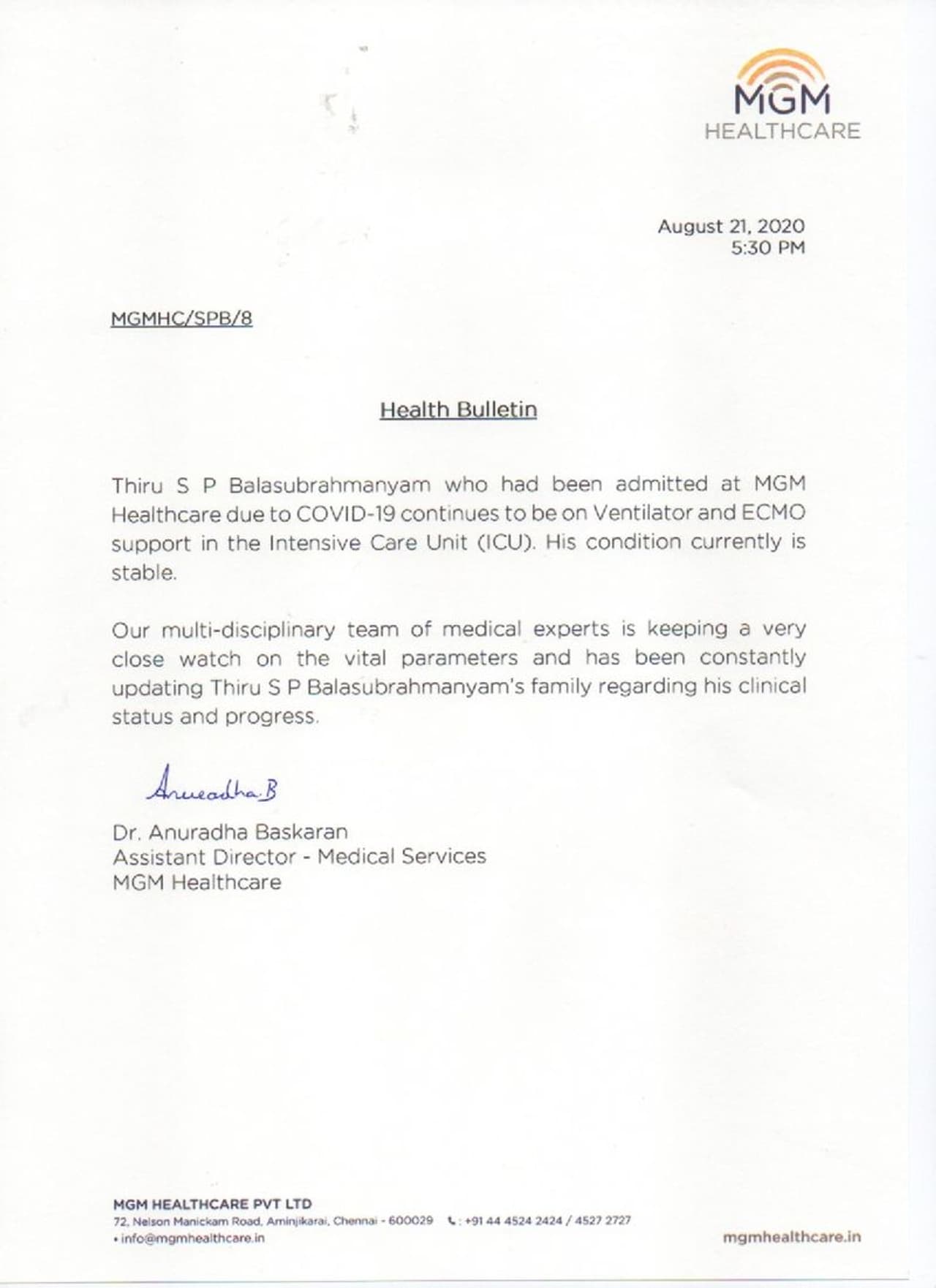 இந்நிலையில் எஸ்.பி.பாலசுப்ரமணியம் உடல் நிலை சீராக உள்ளதாக மருத்துவமனை நிர்வாகம் மகிழ்ச்சியான செய்தியை வெளியிட்டுள்ளது.