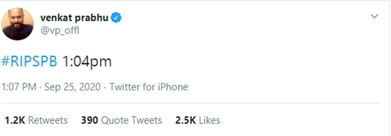 இந்நிலையில் சற்று நேரத்திற்கு முன்பு எஸ்.பி.பி.யை உடல் நிலை குறித்து அறிந்து கொள்ள மருத்துவமனை சென்று திரும்பிய இயக்குநர் வெங்கட் பிரபு அவர் உயிர் பிரிந்துவிட்டதாக தனது ட்விட்டர் பக்கத்தில் அறிவித்துள்ளார். சரியாக இன்று மதியம் 1.04 மணிக்கு எஸ்.பி.பாலசுப்ரமணியம் நம்மை விட்டு பிரிந்ததாக வெங்கட் பிரபு தனது ட்விட்டர் பக்கத்தில் தெரிவித்துள்ளார். ஆனால் மருத்துவமனை தரப்பிலிருந்து இன்னும் அதிகாரப்பூர்வ அறிவிப்பு வரவில்லை.