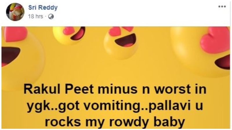 ஆனால் அதற்கு நேர்மாறாக சாய் பல்லவியை புகழ்ந்து தள்ளியுள்ள ஸ்ரீரெட்டி, ரவுடி பேபி சாய் பல்லவி பின்னிட்டார். ஆனால் ரகுல் பிரீத் சிங் ரொம்ப ஒர்ஸ்ட்.படத்துக்குப் பெரிய மைனஸ். அவரைப் பார்த்தாலே குமட்டிக்கிட்டு வாந்தி வருது’ என்று மகா மட்டமாக பதிவிட்டிருக்கிறார். ரகுல் தரப்பிலிருந்து ஒரு ஏவு கணைத் தாக்குதலை மிக விரைவில் எதிர்பார்த்துக்காத்திருக்கிறோம்.