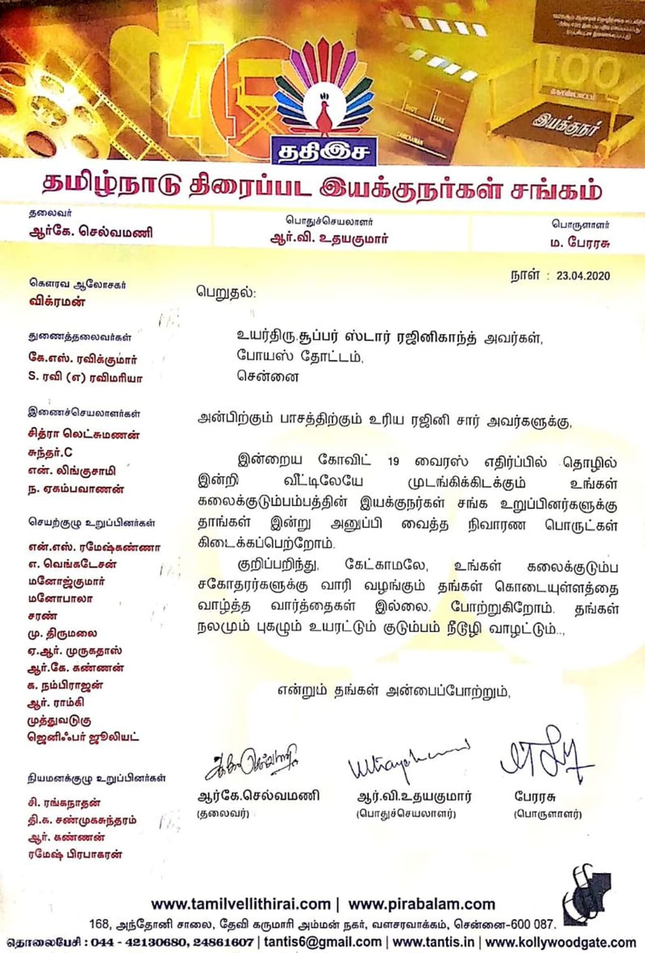இந்த தகவலை கேள்விப்பட்ட சூப்பர் ஸ்டார் ரஜினிகாந்த், நடிகர் சங்கத்தில் உள்ள 1000 நலிந்த கலைஞர்கள் மற்றும் உதவி இயக்குநர்களின் குடும்பத்திற்கு அரிசி மற்றும் மளிகை பொருட்களை வழங்கியுள்ளார். இதற்காக 24 டன்கள் மளிகை பொருட்களை அனுப்பி வைத்துள்ளார். இதேபோன்று கொரோனா ஊரடங்கால் வேலை இல்லாமல் தவித்து வரும் இயக்குநர்கள் சங்கத்திற்கும் நிவாரண பொருட்களை அனுப்பிவைத்துள்ளார். உதவி என்று வாய் திறந்து கேட்பதற்கு முன்பே ஓடோடி வந்து உதவிய சூப்பர் ஸ்டார் ரஜினிகாந்திற்கு திரைப்பட இயக்குநர்கள் சங்கம் சார்பில் நன்றி தெரிவித்துள்ளனர்.