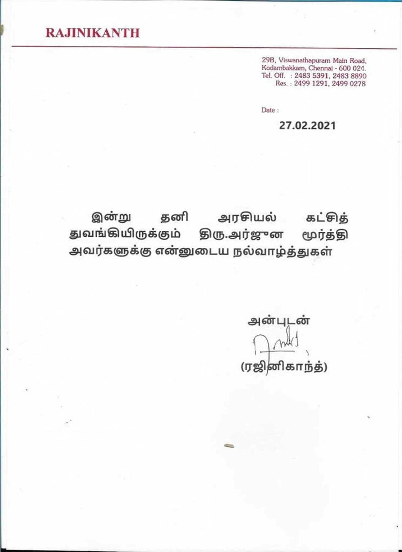 இந்நிலையில் தன்னுடைய நண்பரான அர்ஜுன மூர்த்தி துவங்கியுள்ள கட்சிக்கு, சூப்பர் ஸ்டார் ரஜினிகாந்த்... அறிக்கை வெளியிட்டு வாழ்த்து தெரிவித்துள்ளார். இதில் அவர் கூறியுள்ளதாவது... " இன்று தனி அரசியல் கட்சி துவங்கி இருக்கும் திரு.அர்ஜுன மூர்த்தி அவர்களுக்கு என்னுடைய நல்வாழ்த்துக்கள். என தெரிவித்துள்ளார்.