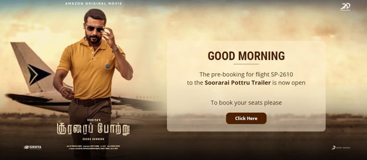 சூரரைப் போற்று பட டிரெய்லர் ரிலீஸ் குறித்து நடிகர் சூர்யா தனது ட்விட்டர் பக்கத்தில் வீடியோ ஒன்றை வெளியிட்டுள்ளார்.