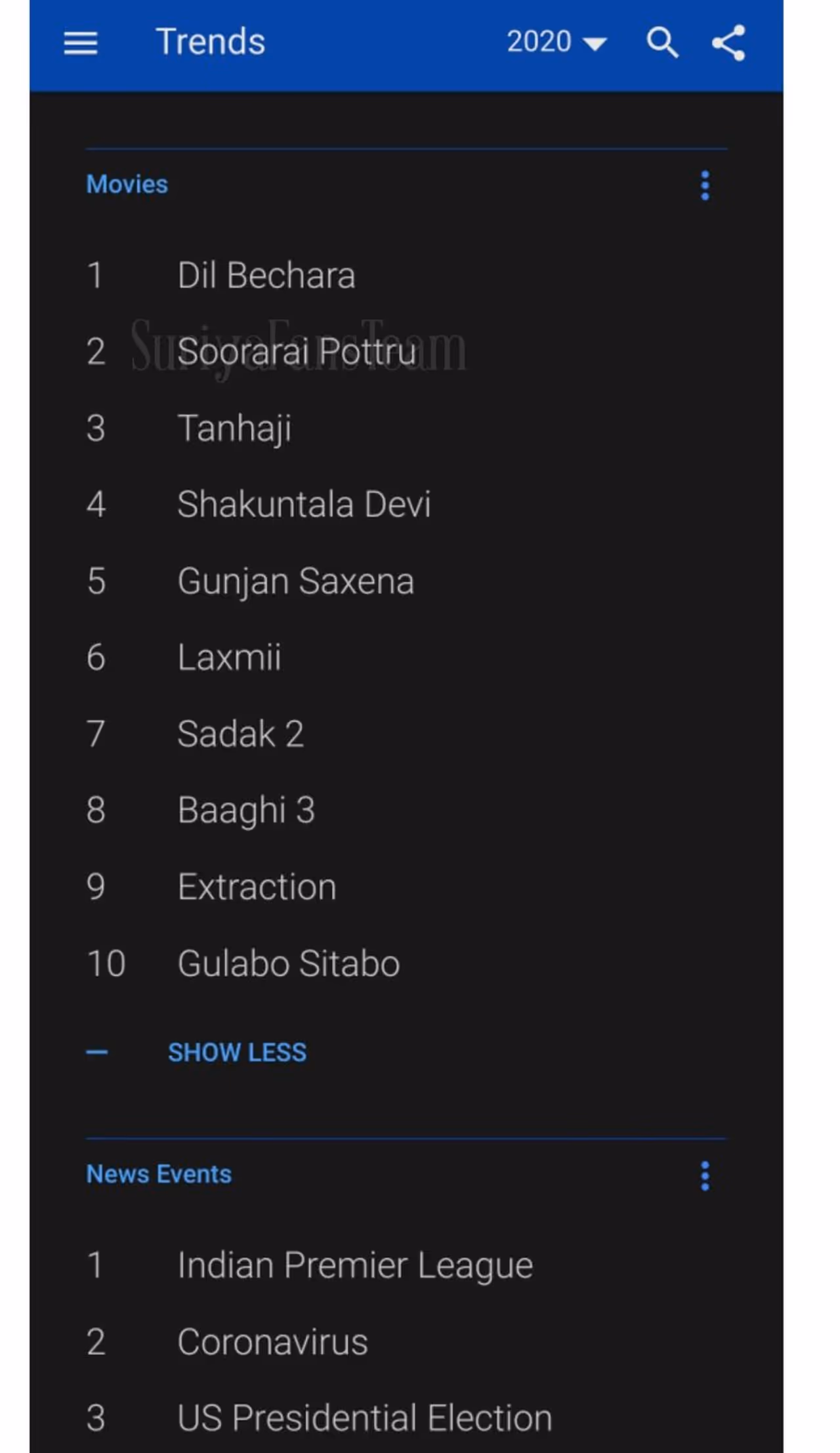 அதுமட்டுமின்றி சமீபத்தில் 2020ம் ஆண்டில் ட்விட்டரில் அதிகம் ட்வீட் செய்யப்பட்ட பட ஹேஷ்டேகுகளில் #SooraraiPottru இரண்டாவது இடம் பிடித்து சாதனை படைத்தது. இதை சூர்யா ரசிகர்கள் #SURIYARuledTwitter2020 என்கிற ஹேஷ்டேகுடன் ட்வீட் கொண்டாடி தீர்த்தனர். தற்போது மற்றொரு சாதனையாக கூகுளில் அதிகம் தேடப்பட்ட இரண்டாவது திரைப்படம் என்ற பெருமையையும் சூரரைப் போற்று படைத்துள்ளது.