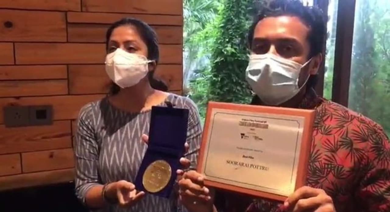 தற்போது கொரோனா காலம் நீடித்து வருவதால், அனைவரது பாதுகாப்பு கருதி, விருது கொடுப்பதற்கு விழா நடத்தாமல், பிரபலங்களுக்கு இந்த விருதுகளை பார்சலில் அனுப்பி வருகிறார்கள். அந்த வகையில் 'சூரரை போற்று' படத்திற்கு சிறந்த நடிகருக்கான விருதை பெற்ற சூர்யா இந்த விருதை தன்னுடைய மனைவியுடன் பிரித்து பார்க்கும் வீடியோ தற்போது சமூக வலைத்தளத்தில் வைரலாகி வருகிறது. தன்னுடைய கணவரை ஜோதிகா கரகோஷம் எழுப்பி உத்சாக படுத்துகிறார். மேலும் ரசிகர்கள் பலர் தொடர்ந்து தங்களது வாழ்த்துக்களை சூர்யாவுக்கு தெரிவித்து வருகிறார்கள்.