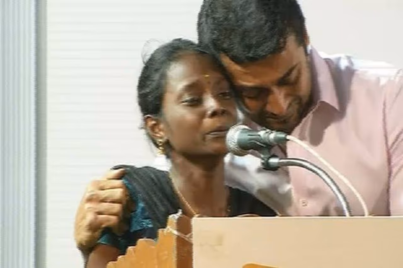 அவரது உருக்கமான பேச்சைகை கேட்ட நடிகர் சூர்யா மேடையிலேயே கண்ணீர் விட்டு அழுதார். ஒரு கட்டத்தில் எழுந்து சென்று பேசிக் கொண்டிருந்த மாணவியை அருகில் சென்று தேற்றினார். இந்த சம்பவம் அங்கிருந்த அனைவரையும் கண் கலங்கச் செய்தது.
