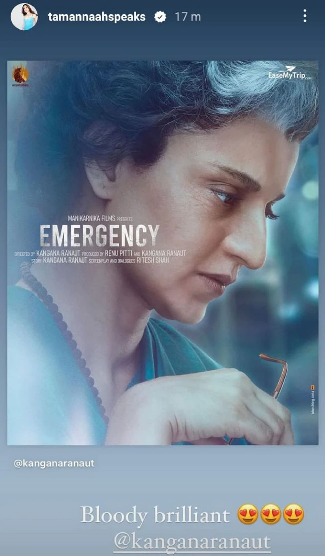 இதற்கிடையே எமர்ஜென்சி டீசர் குறித்து பாலிவுட் பிரபலங்கள் அர்ஜுன் ராம்பால், திவ்யா தாத்தா மற்றும் ஏக்கா கபூர் ஆகியோர் பாராட்டு தெரிவித்திருந்த நிலையை தமன்னா பாட்டியா " பிளடி ப்ரில்லியண்ட் " என குறிப்பிட்டு பாராட்டியுள்ளார்.
